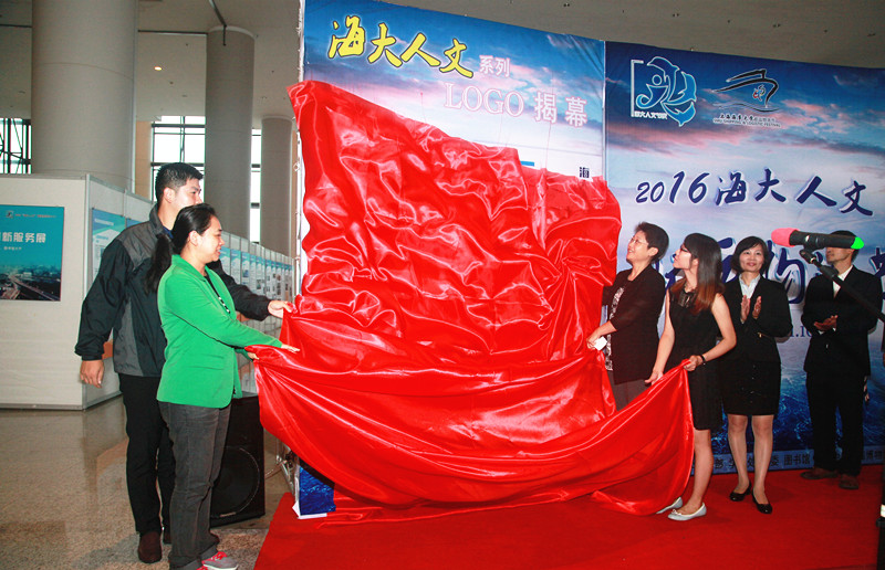门妍萍、焦玉玲、孙筱和以及“海大人文”LOGO设计大赛获奖学生代表范玮琳共同为“海大人文”系列LOGO揭幕。