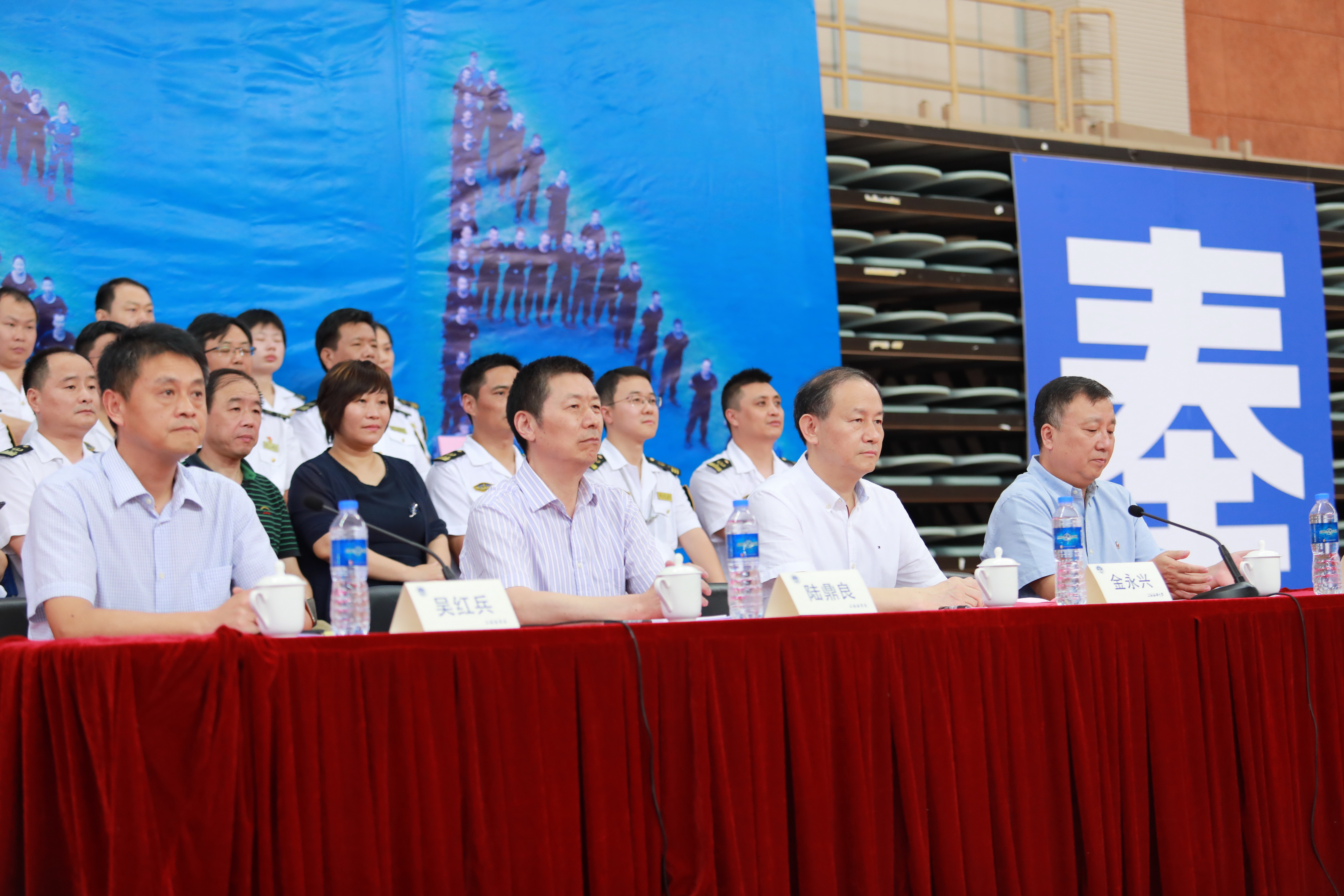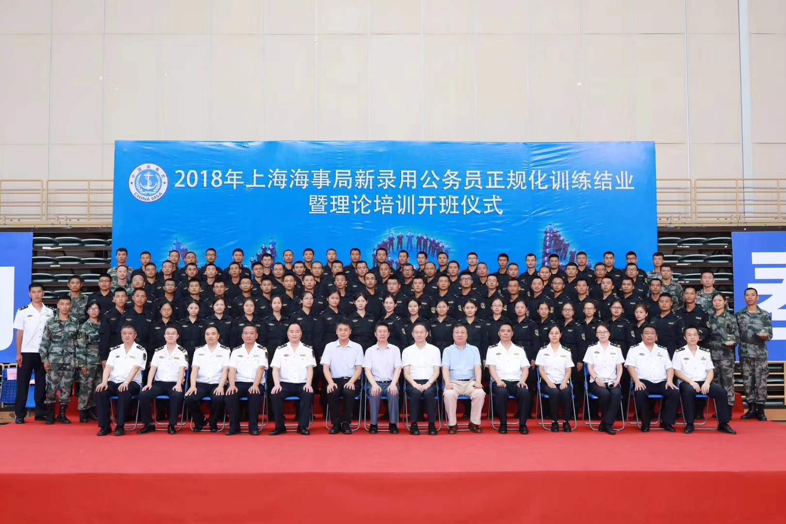 日前(8月24日),2018年上海海事局新录用公务员正规化训练结业暨理论培训开班仪式在上海海事大学体育馆举行。上海海事大学党委书记金永兴,上海海事局局长陆鼎良、副局长吴红兵,上海海事局以及上海海事大学相关部门负责人等出席仪式,共同观看正规化训练成果汇报。