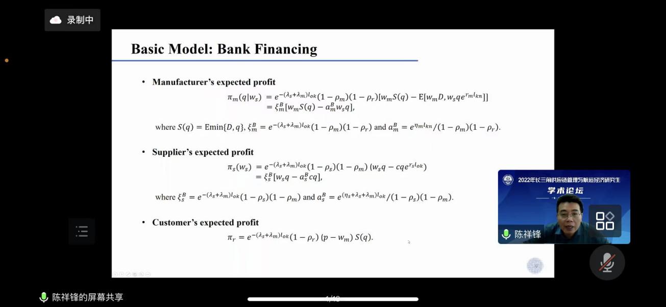 论坛举行了4个学术分论坛,与会研究生们通过在线的方式参与学术交流。江西财经大学物流管理专业熊万志同学、宁波大学物流管理专业李敏同学、上海海事大学管理科学与工程专业贾筱笛同学分别就当前金融科技对供应链金融的影响分析、供应链成员进入逆向供应链回收时的策略选择、企业在疫情时应建立弹性供应链等方面作了重点交流发言。