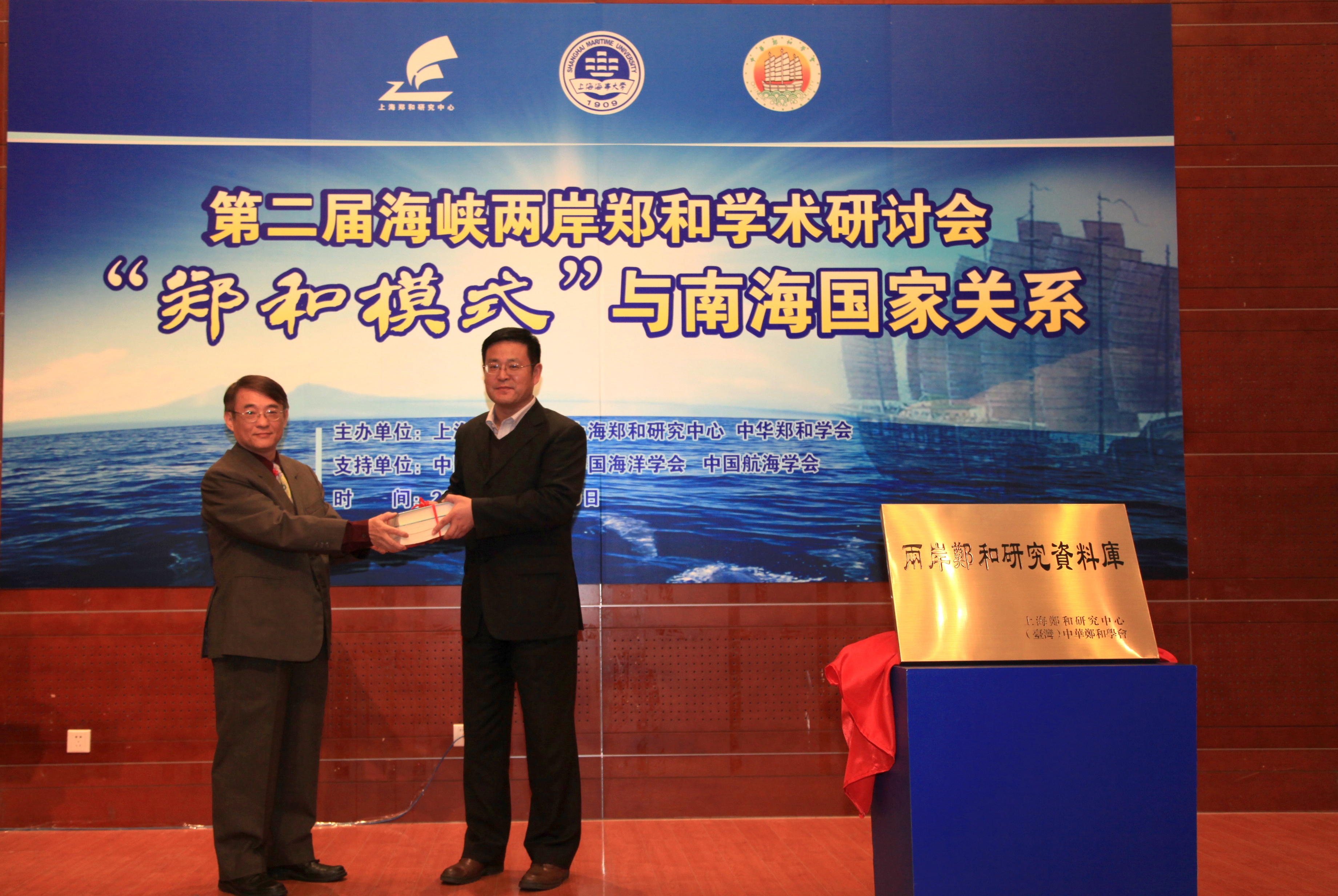 金永兴副校长与(台湾)中华郑和学会常务理事章乐绮博士共同为“两岸郑和研究资料库”揭牌。美国、巴西、新加坡及台湾等国家和地区的学者向两岸郑和研究资料库捐赠了图书。