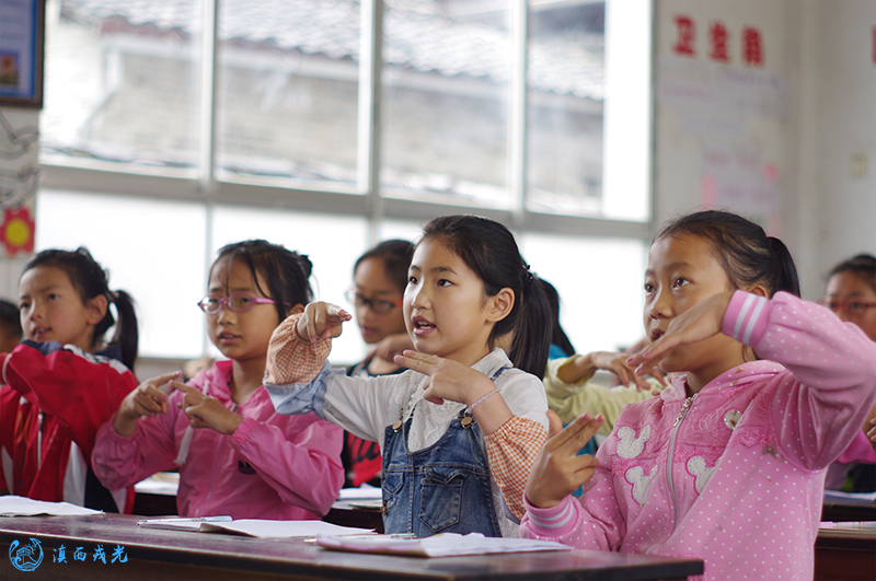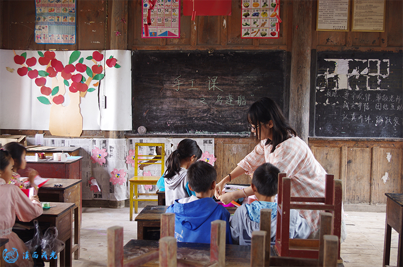 教学活动中,不但开设了基础学科(语文、数学、英语),还依家长、孩子们所盼,开设了手工、声乐、美术、手语、体育、军体课等课外拓展类课程。其中,手工课和军体课分别教授带有海事大学特色的“水手工艺”和军体拳术;声乐课教授吉他以及基本乐理知识;手语课以《仰望星空》为主题教授简单的手语表达。除此之外,还有队伍特色的“职业体验课”,根据孩子们写满梦想的小纸条,队员们将109名同学分别分入“军人班”“科学家班”“医生班”“明星班”“老师班”等5种不同职业的班级,7名“滇西戎光”的队员利用“情景设计”“职业模拟”等方式,让同学们全面体验这5个职业,并从职业素养、职业目标、职业意义等方面出发,对每个职业进行介绍,同学们积极响应,效果显著。体验课程旨在让孩子们切身感受职业的魅力,让他们知道未来并不抽象。由于腾冲猴桥镇地处滇缅边境的特殊地理位置,靠近缅甸,实践队特别开设了“禁毒教育课”,旨在让孩子们从小就有良好的防毒意识,自觉远离毒品,“防毒、禁毒”从小开始。