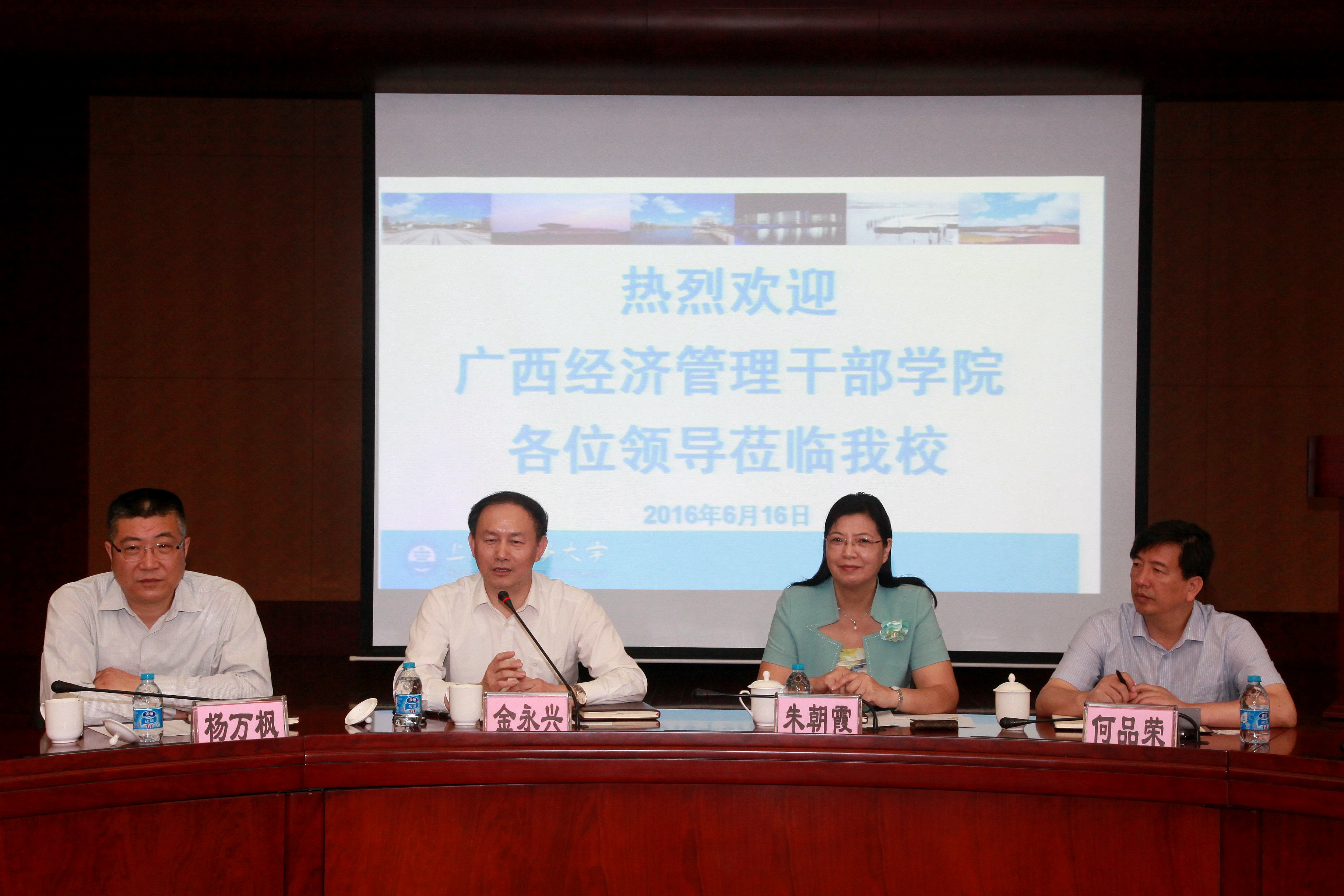6月16日,广西经济管理干部学院院长朱朝霞、副院长何品荣,以及各二级部门负责人等来上海海事大学访问、调研。我校党委书记金永兴、副校长杨万枫等与来宾进行了会谈。