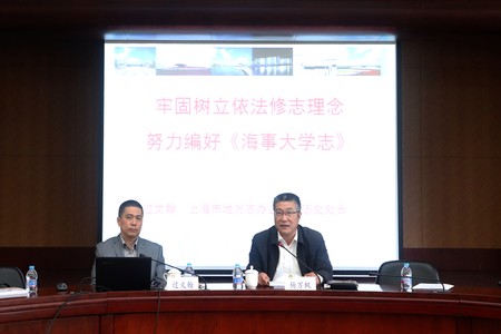 为推动校志编纂工作开展,4月21日,我校邀请上海市地方志办公室专志处处长过文瀚来校作了以“牢固树立依法修志理念,努力编好《海事大学志》”为主题的辅导报告。杨万枫副校长表示,校志具有存史、资政、育人的功能,希望大家增强责任意识、质量意识,以高度的责任心努力完成此项工作。 2017-04-21, 星期五 -