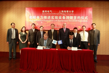 6月17日上午,通用电气中国有限公司(GE)与上海海事大学船舶电力推进实验设备捐赠签约仪式在行政楼128会议室举行,双方共建的中国境内首家船舶电力推进及自动控制实验室项目正式启动实施。 2014-06-19, 星期四 -