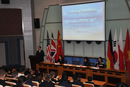 3月4日,我校第四期国际交流班项目正式开班。本期共有来自美国、德国、波兰、韩国、越南和英国的33名留学生来校学习。美国麻省海事学院教师代表Chen Qi、Mirey Medina,我校金永兴副校长及相关学院、部门负责人等出席开班典礼。 2013-03-05, 星期二