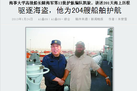 1月16日,在中国海军第12批亚丁湾、索马里海域护航编队圆满完成护航任务胜利返回祖国之际,中国海军第12批护航指挥员、东海舰队副参谋长周煦明和编队政治委员、某驱逐舰支队政委翟永远代表海军东海舰队政治部致信感谢我校。 2013-01-17, 星期四
