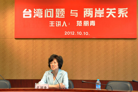 10月10下午,中共中央台湾工作办公室、国务院台湾事务办公室新闻发言人范丽青女士来到上海海事大学,为我校党委学习中心组、社科部教师作了“台湾问题与两岸关系”的专题报告。报告会由校党委书记於世成主持。 2012-12-07, 星期五