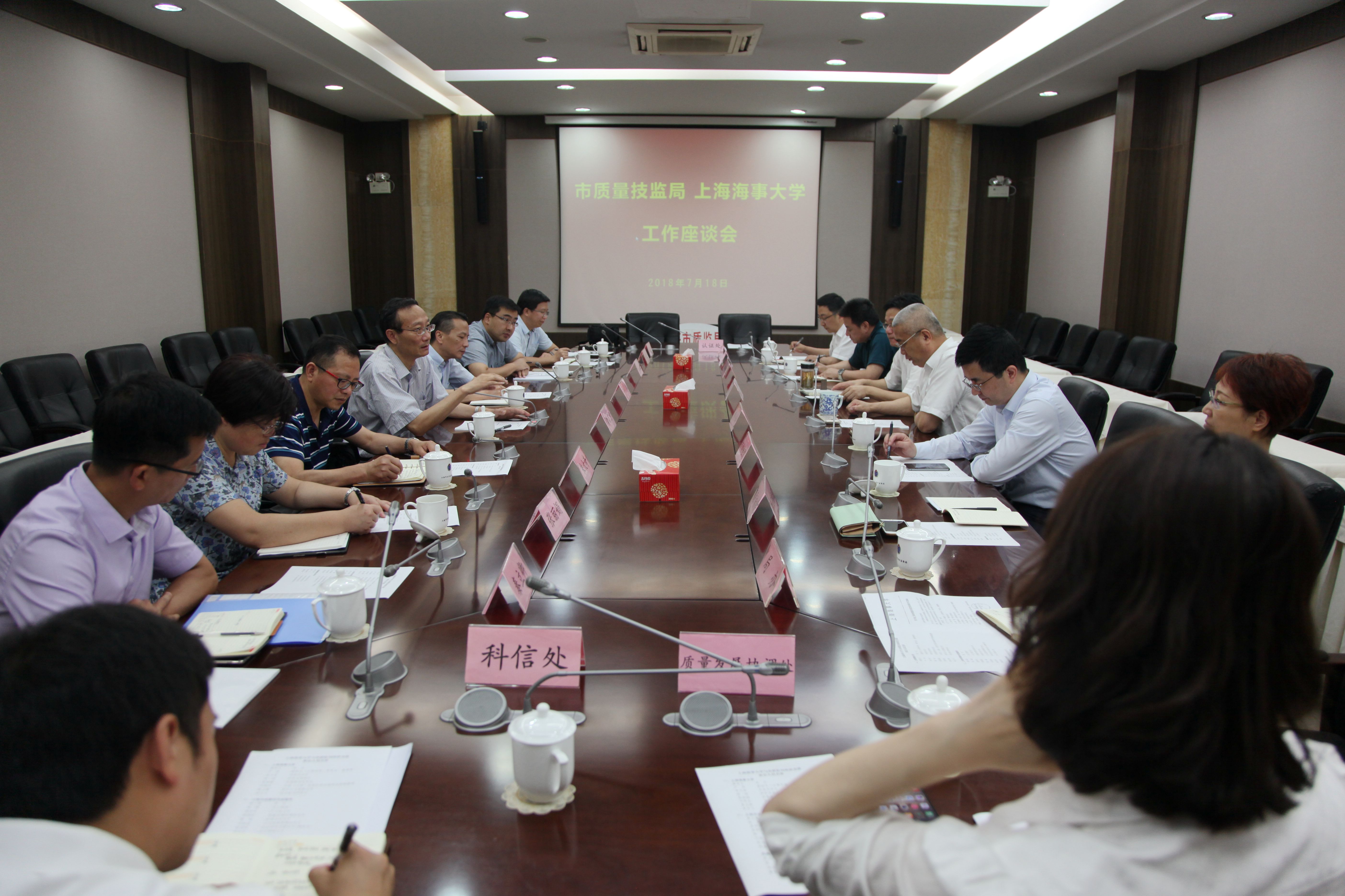 7月18日,上海海事大学校长黄有方、副校长严伟等一行拜访了上海市质量技术监督局,受到了上海市质量技术监督局局长黄小路、总工程师陆敏,上海市特种设备监督检验技术研究院院长舒文华、上海市质量监督检验技术研究院院长季飞、上海市质量和标准化研究院院长杨洁明、上海市计量测试技术研究院副院长曹程明等领导的热情接待。上海市质量技术监督局办公室、质量发展协调处、标准化处、认证监督管理处、科技信息处,我校校长办公室、科技处、研究生院、发展规划处、中国(上海)自贸区供应链研究院等部门负责人参加座谈。