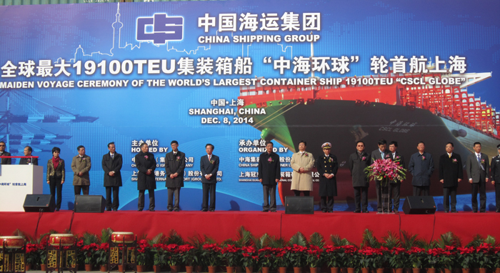 “中海环球”轮是2013年中海集运与韩国现代船厂订造的5艘19100TEU型集装箱船舶中首制船。该船全长400米、宽近60米,设计吃水14.5米,服务航速23节,集成了当今世界主要的先进航海技术, 被誉为“航运业的A380”。