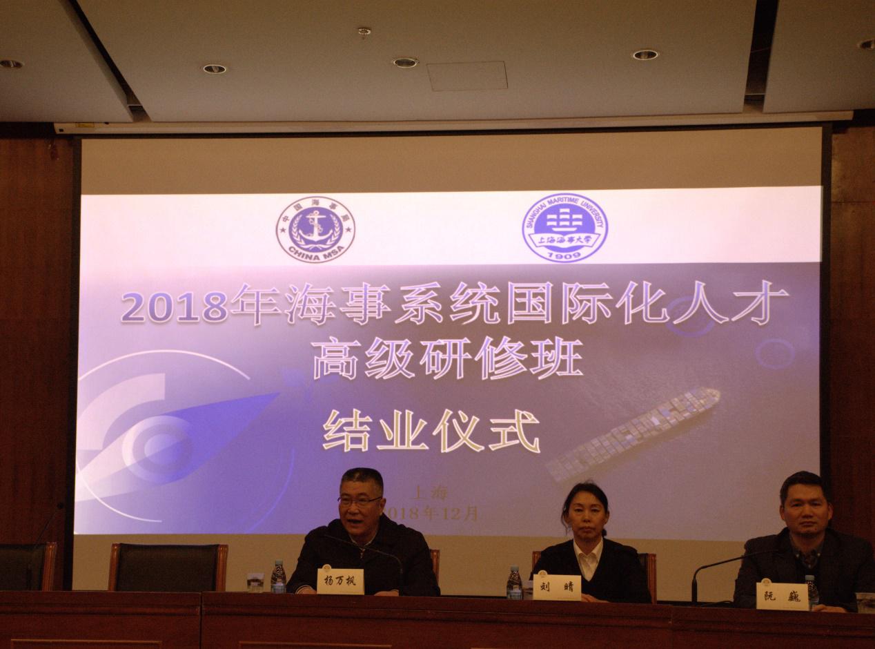 12月14日上午,2018年交通运输部海事系统国际化人才高级研修班结业仪式在上海海事大学举行。来自全国海事系统的40名学员圆满完成了为期3个月的脱产学习,顺利通过了结业考核。我校副校长杨万枫、交通运输部海事局副局长刘晴出席,上海海事局相关处室、我校相关学院负责人等参加了结业仪式。