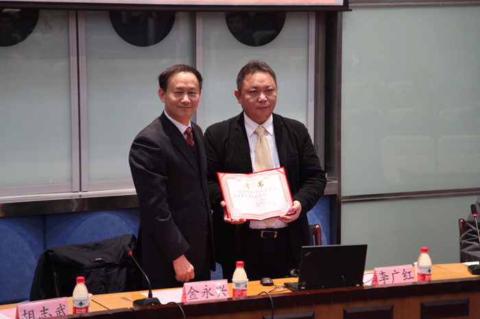 商船学院肖英杰院长介绍了李广红船长的履历与学术成就。金永兴副校长为李广红船长颁发聘任证书,佩戴校徽。