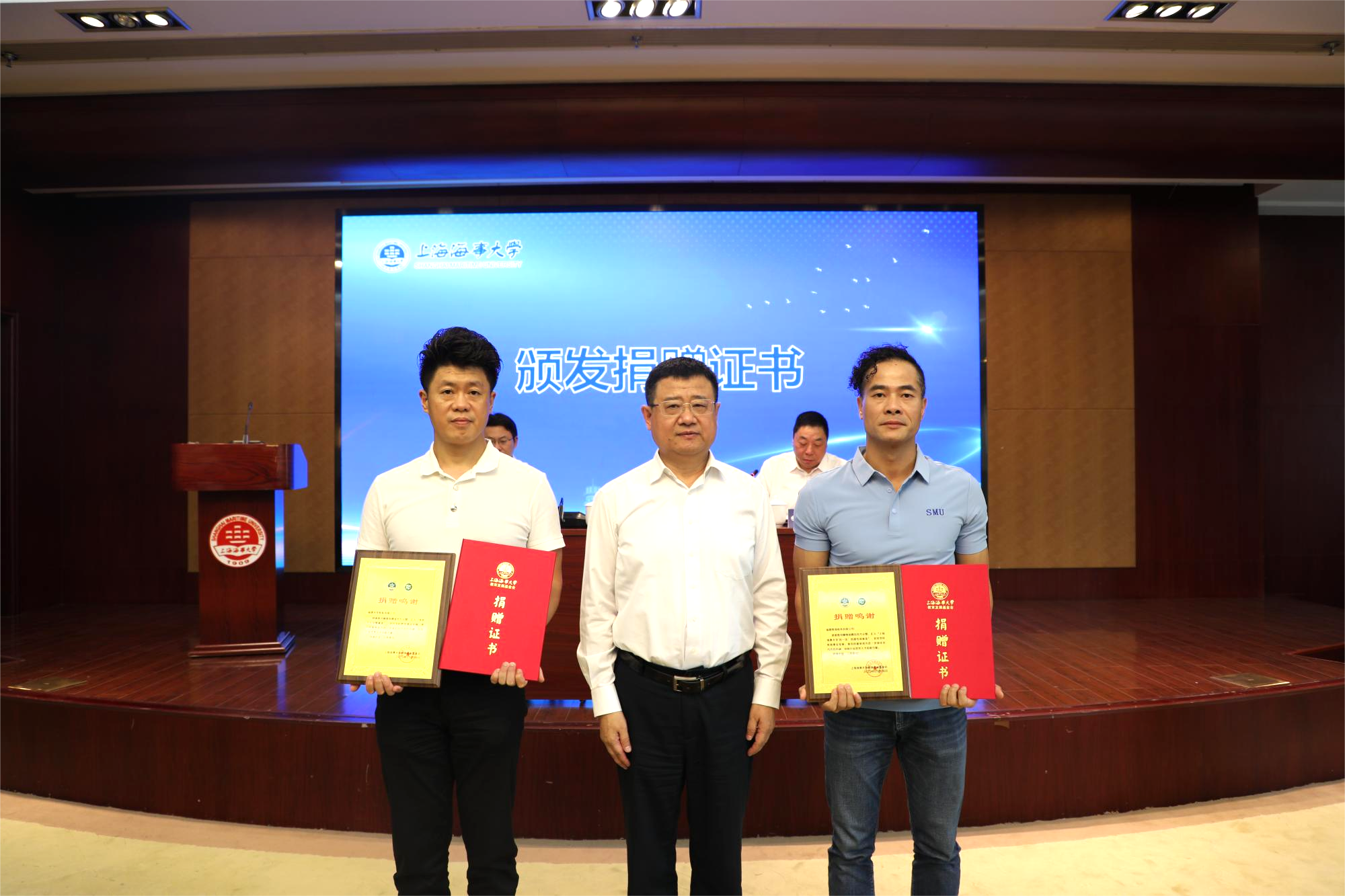 第一期研修班班长、福建辉海船务有限公司董事长丁瑞生校友向学校“双一流”创建专项基金捐赠人民币50万元;校友福建天龙轮船有限公司董事长洪啸校友向体育部体育文化建设基金捐赠人民币20万元。宋宝儒为两位校友颁发捐赠证书和鸣谢牌,并对他们心系母校、慷慨助学的善举表示高度赞赏。