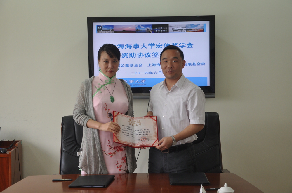 王海威、倪迎佳代表双方签署了上海海事大学宏信奖学金资助协议。