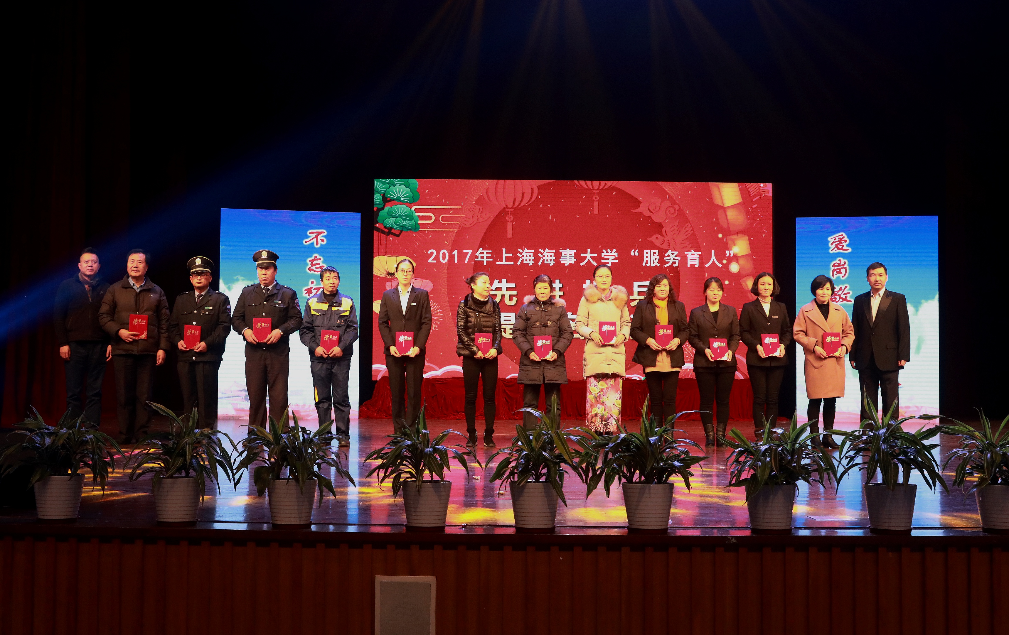 王海威副书记为上海生乐物业管理有限公司环境保洁服务组、上海家佳物业管理有限公司学生公寓服务组等6个“服务育人”先进班组,保安队长周建东、学生公寓宿管员张兰文等10名“服务育人”先进标兵,陈平、康明等24名先进标兵提名奖获得者分别颁发了奖牌、奖杯和荣誉证书,并对获奖的先进班组和标兵表示祝贺。