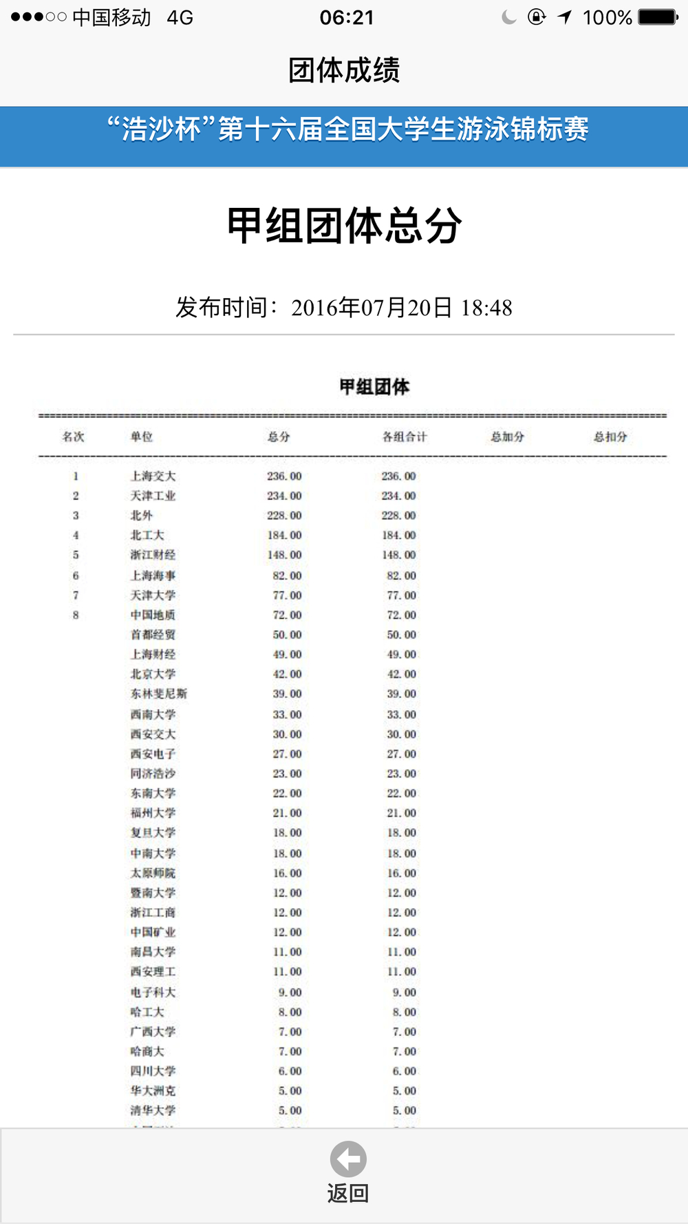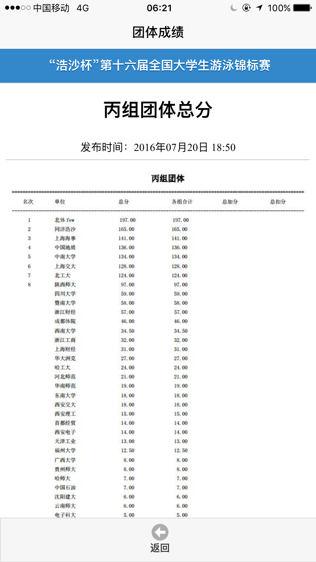 我校游泳队此次比赛由领队体育部主任王国勇老师、教练赵伟民和袁锐老师带队,所有参赛选手均进入全国前八名。其中,国航157班姚忆慧同学在女子甲组100米和200米仰泳;国航126班的张杰在男子丙组200米和400米自由泳,国航157班的顾斯文在女子丙组200米蝶泳、许丹露在女子丙组400混中为我校取得了金牌。我校最终取得了丙组团体总分第三,甲组团体总分第六的历史最好成绩,并获得了赛事组委会颁发的体育道德风尚奖。