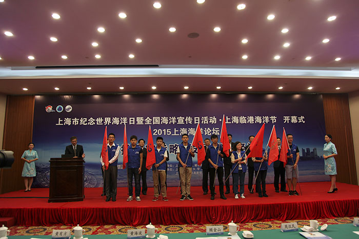 在开幕式上,全国政协常委、民建中央副主席、上海市主委、上海市政协副主席周汉民等参会领导为海洋环保志愿者服务队授旗。