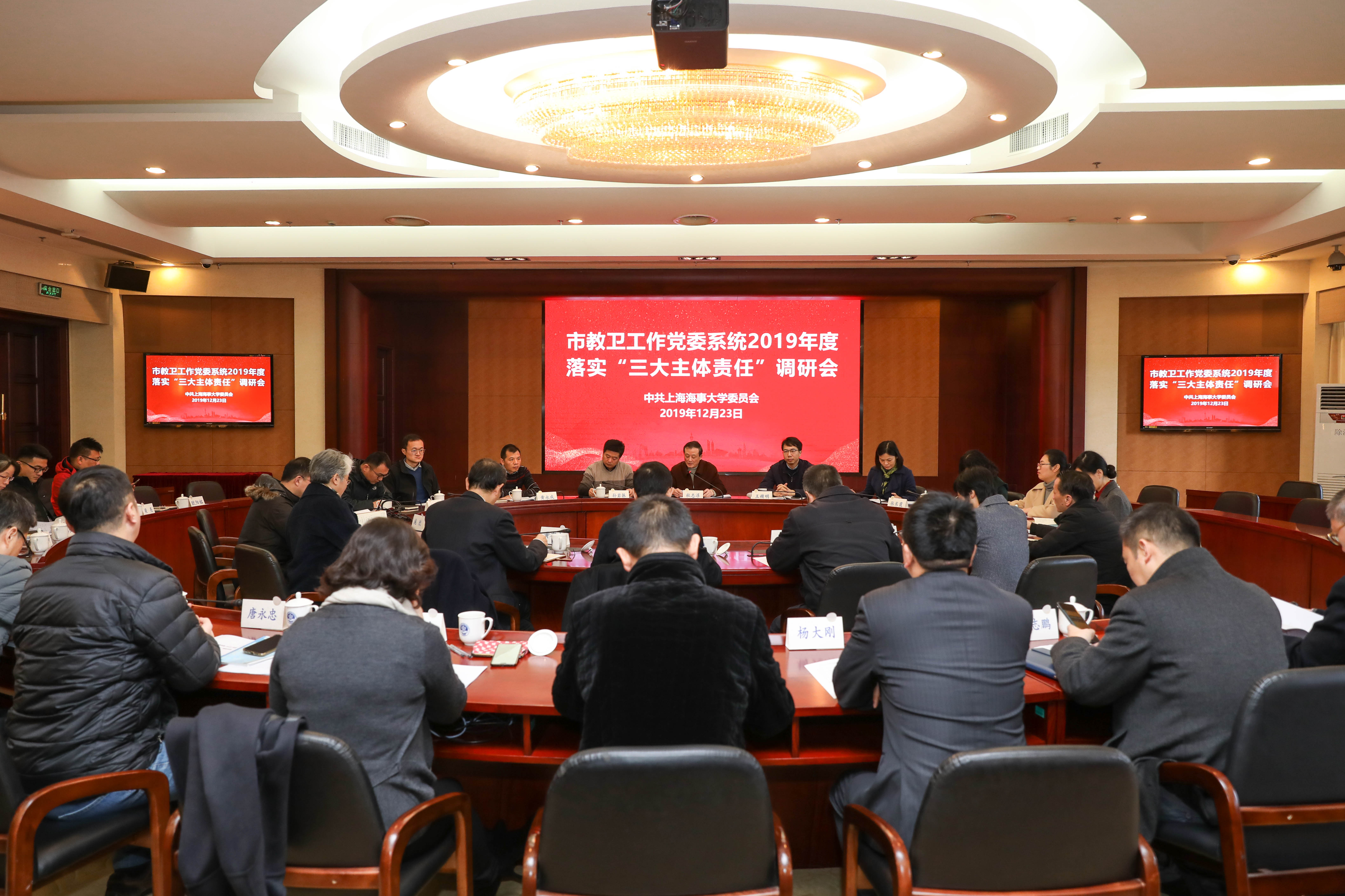 为进一步推动全面从严治党向基层延伸,促进党的建设全面进步、全面过硬,按照上海市教卫工作党委关于“意识形态工作、基层党建工作、党风廉政建设和党内监督工作”三大主体责任(以下简称“三大主体责任”)“同部署、同推进、同考核”的总体部署安排,12月23日,上海市教卫工作党委2019年度落实“三大主体责任”第一调研组组长、华东政法大学原党委书记杜志淳一行来到上海海事大学,开展为期一天的调研检查工作。校领导宋宝儒、黄有方、杨万枫、门妍萍、贺莉、施欣、严伟,以及相关部门负责人等出席调研检查见面会。