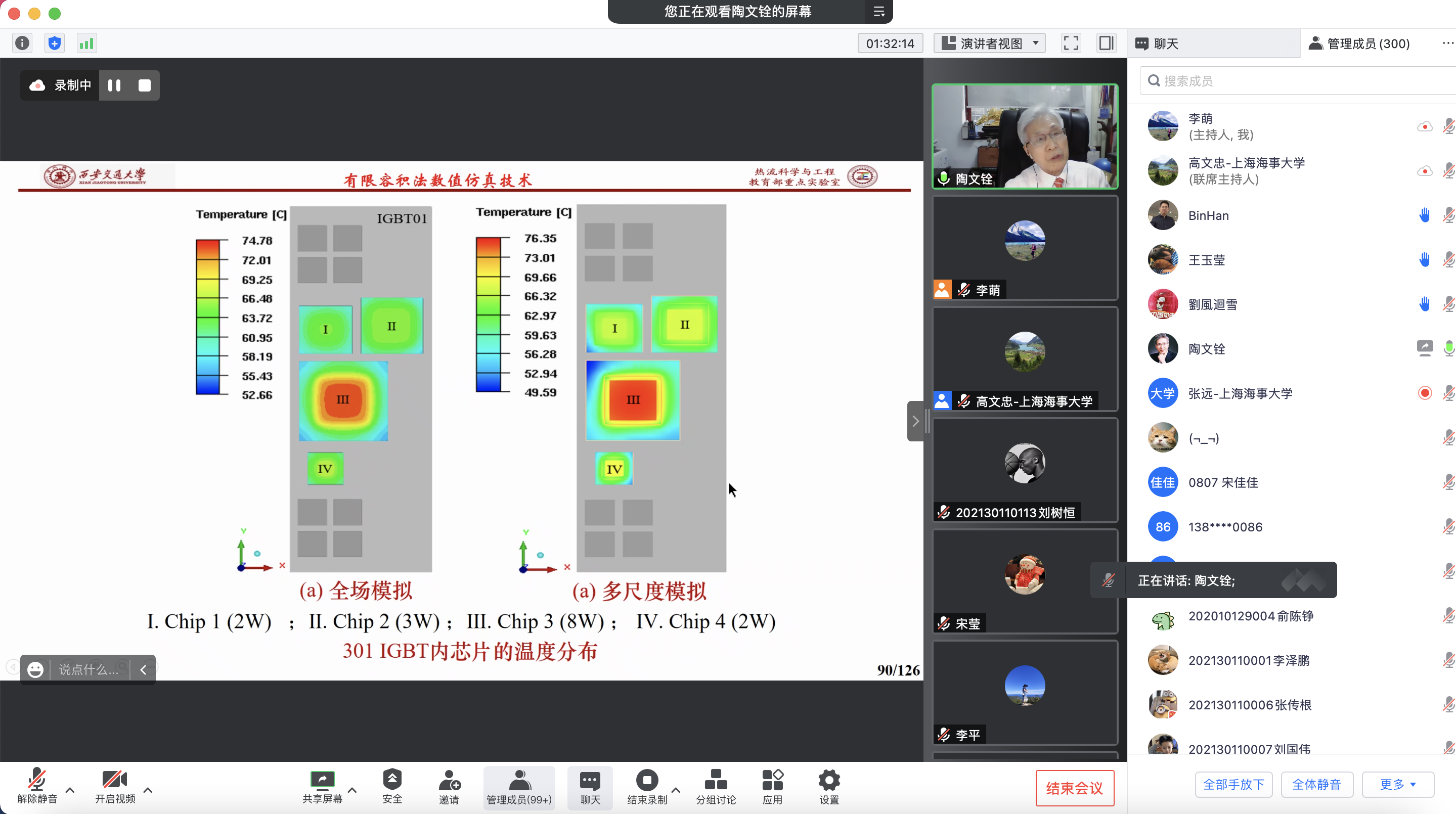 在互动交流环节中,陶文铨院士就计算流体力学(Computational Fluid Dynamics,CFD)软件国产化、数值计算中的实验验证、数值传热学 (Multiphysics Heat Transfer,MHT)软件在燃料电池求解中的介观处理等问题和与会师生进行了深入交流与探讨。