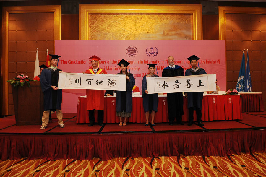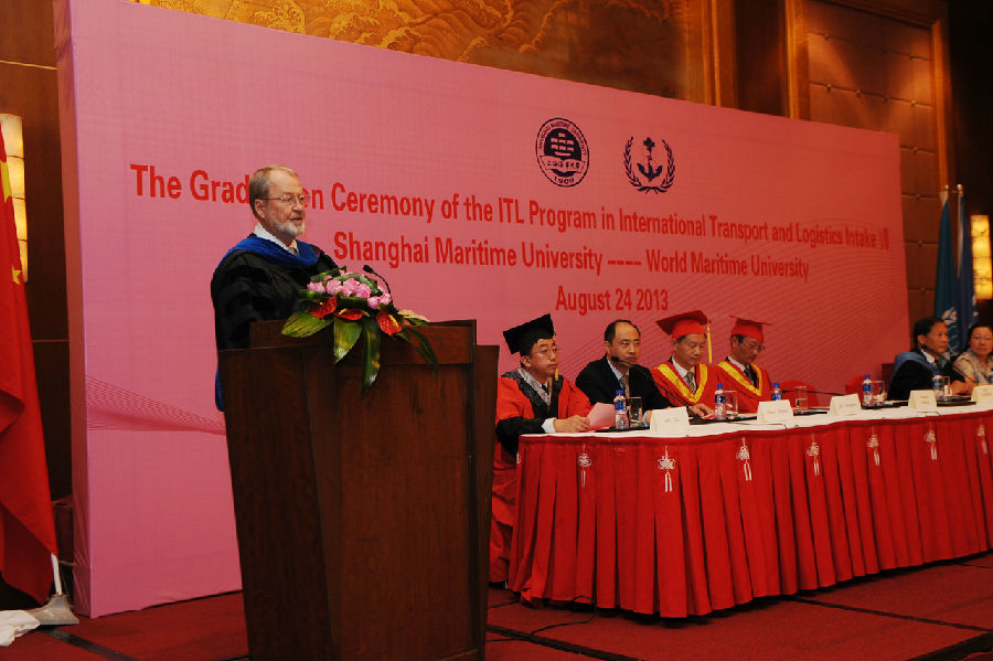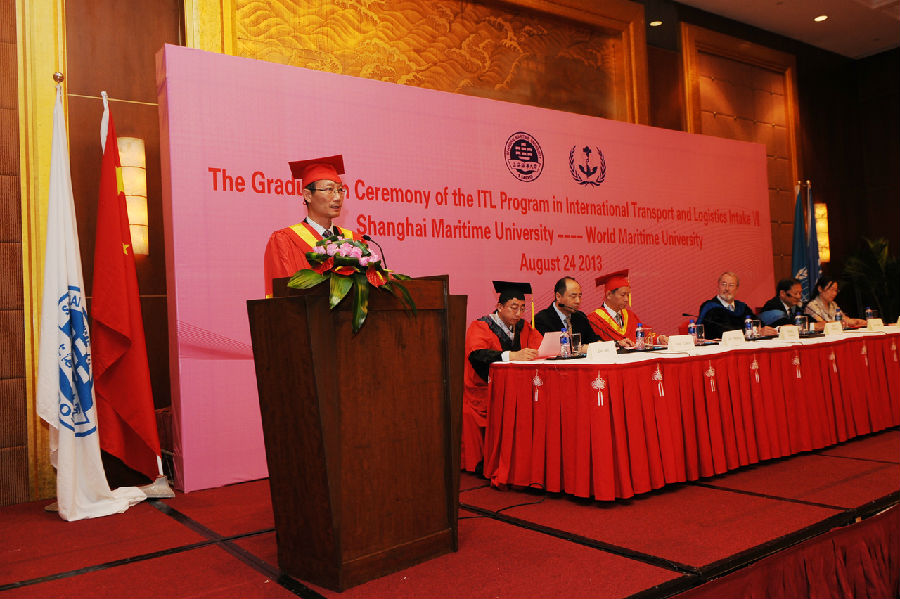 8月24日上午,上海海事大学与世界海事大学合作举办的“国际运输与物流”硕士项目第八届学员毕业典礼顺利举行。世界海事大学校长比昂·沙瑞夫、副校长马硕,我校校长黄有方、副校长金永兴及国际交流处、交通运输学院等部门负责人出席毕业典礼。毕业典礼由交通运输学院院长施欣主持。