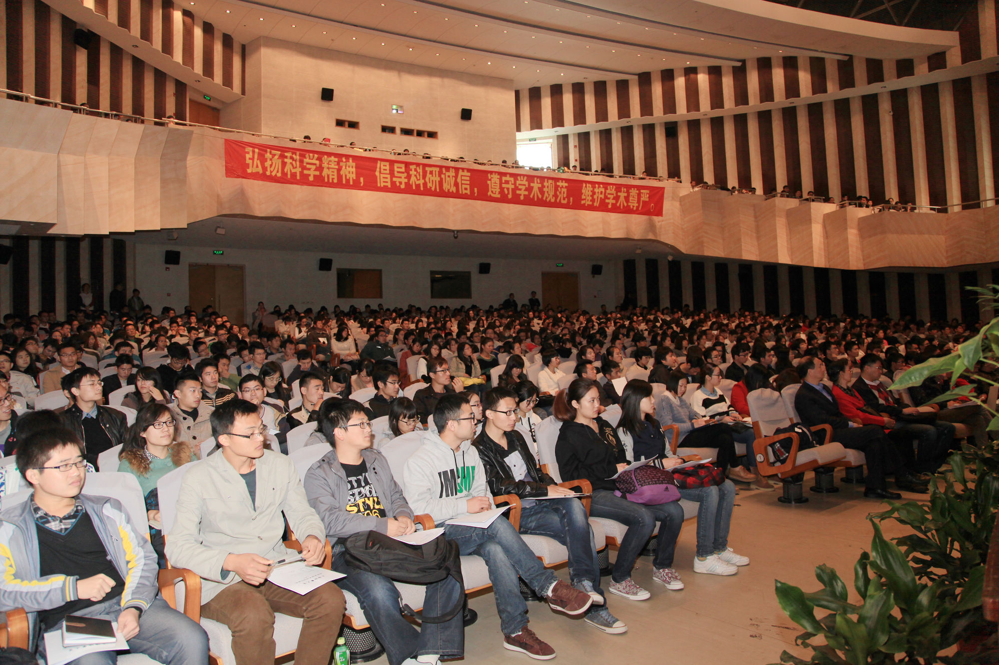 杨福家院士以《梦想、机会、奋斗》为题,结合自身经历,与研究生们畅谈十点体会。他引用1828年的《耶鲁报告》,指出“做人第一,修业第二”,这是世界上任何一所优秀大学的基本准则,而“诚信第一”则是做人的第一要素。他以典型的事例,告诫广大青年学子要树立学术诚信意识,认真遵守学术规范,不仅要在专业上出类拔萃,更要在品德上高尚出众。