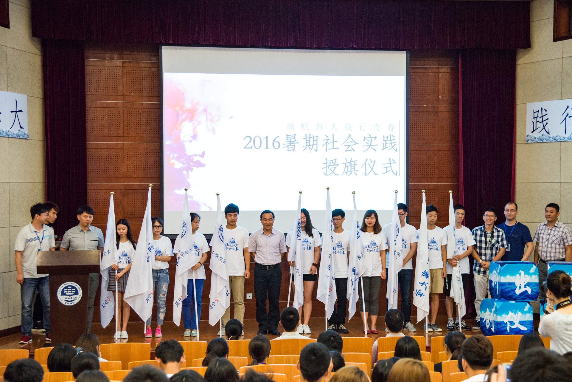 近日,上海海事大学举行“扬帆海大,践行青春”暑期社会实践出征仪式。学校62支实践队伍、1000余名师生将于今年暑假奔赴全国各地,开展形式多样、内容丰富的社会实践活动。副书记、副校长王海威, 学生处、教务处、团等部门负责人,各学院团委书记、2016年暑期社会实践队伍代表等参加仪式。
