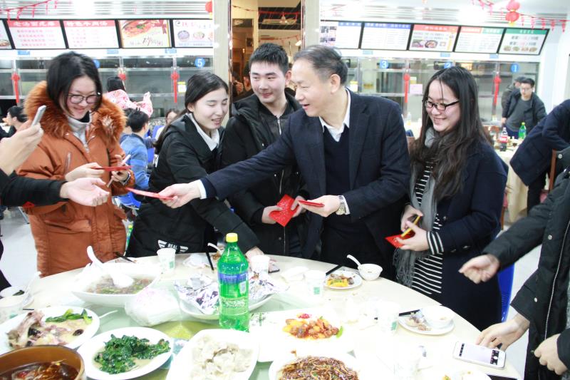 团拜会上,学校领导和嘉宾还给每位学生派送了“压岁包”,为春节不能回家和亲人团聚的孩子们“压岁”。学生们纷纷与书记、校长合影留念,在歌声中祈福未来。学校的关心、关怀令同学们十分感动,法学院周同学表示,新春佳节虽不能与家人团圆,但留在学校的日子里,并不孤单,因为这里有老师同学,这里有家一样的温暖,感谢学校领导老师对我们的关心。