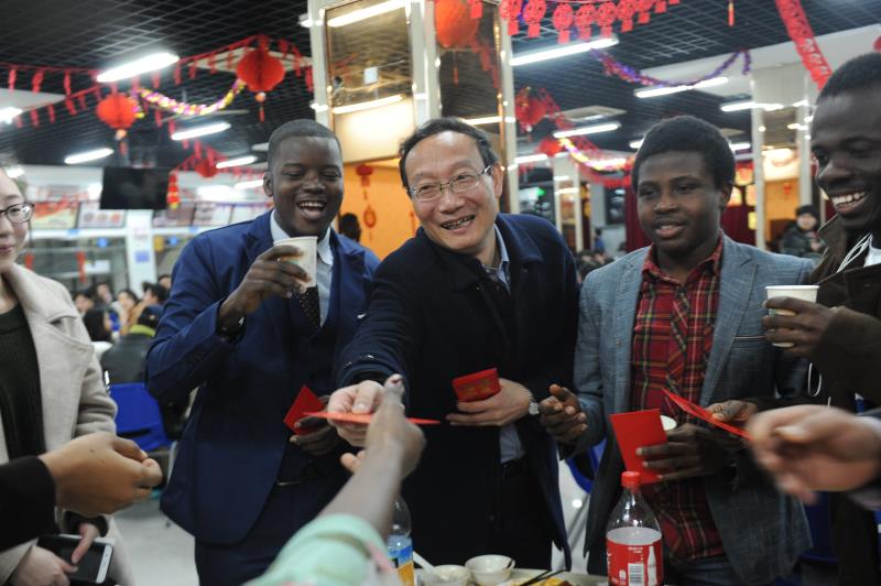 金鸡辞旧欢欣鼓舞庆胜利,玉犬迎春豪情满怀谱新篇。2月12日下午,上海海事大学2018年寒假留校学生迎春团拜会在海联食堂二楼举行。洋泾街道综合事务办主任池春娟,我校党委书记金永兴,校长黄有方,党委副书记、副校长王海威,部分职能处室、学院负责人及辅导员代表,全体留校中国学生,以及来自美国、智利、加纳、越南、尼泊尔等16个国家的60余名留学生共计270余人齐聚一堂,欢庆狗年新春佳节,共话学校美好未来。