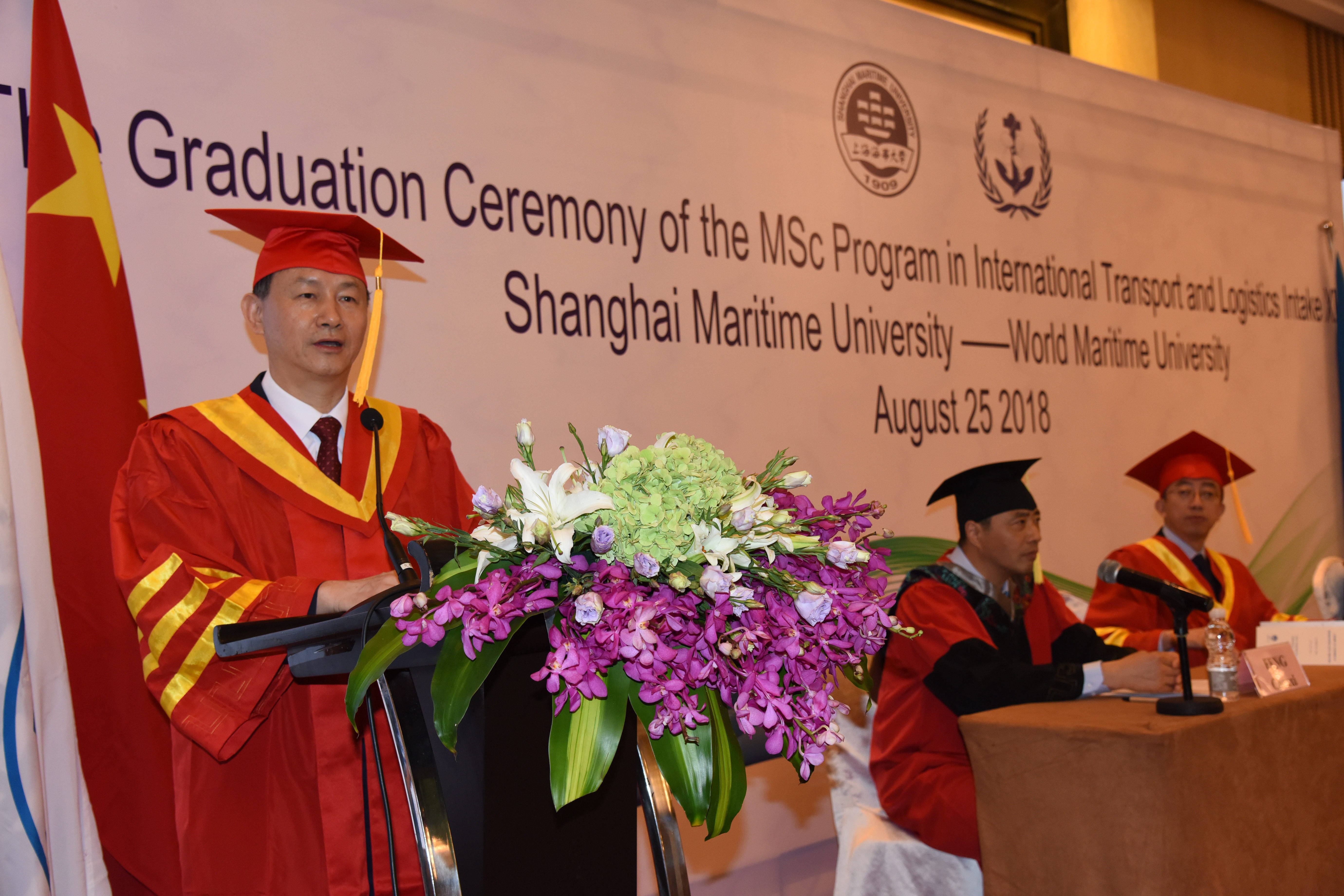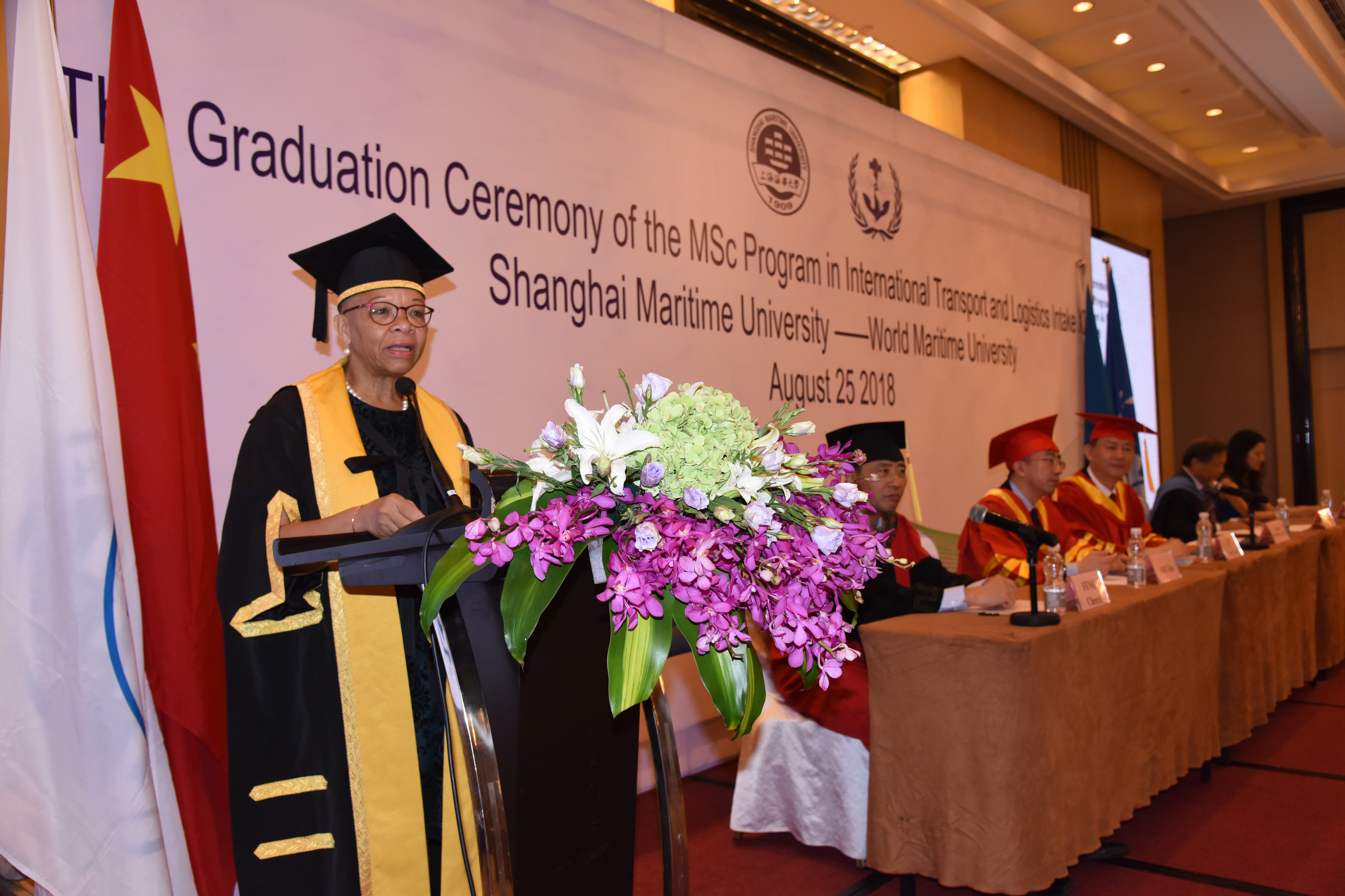 8月25日上午,上海海事大学与世界海事大学合作举办的“国际运输与物流”硕士项目(海大班)第十三届学员毕业典礼顺利举行。我校党委书记金永兴、副校长施欣,世界海事大学校长杜姆比亚-亨利(Cleopatra Doumbia-Henry)、副校长马硕,我校交通运输学院、21世纪丝绸之路研究院、国际教育学院等相关领导及教师代表,国际租箱协会(IICL)代表、卡尔玛(KALMAR)全球代表康尼埃利亚松(Conny Eliasson)等嘉宾出席毕业典礼。毕业典礼由副校长施欣主持。