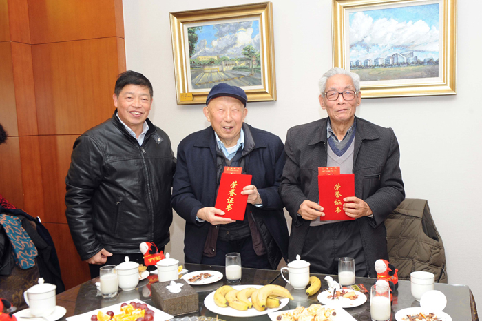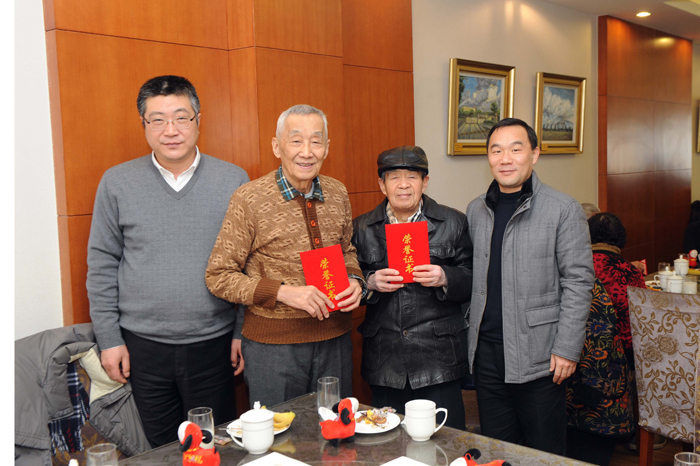 团拜会上,校领导向获上海海事大学2014年“五好老人”“和睦家庭”及“活动积极分子”荣誉称号的老同志颁发荣誉证书和奖金。