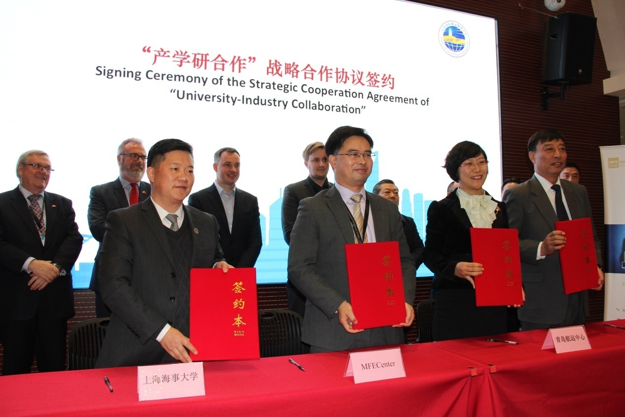会上,我校共签署三项战略合作协议。其中,一项是上海海事大学外国语学院与青岛市国际航运服务中心、上海航运和金融产业基地、挪威科技大学中国代表处、南京理工大学经济管理学院就产学研合作签署战略合作协议;另两项是上海海事大学外国语学院与上海航运和金融产业基地就共建“国际航运翻译中心”、共建“上海海事大学MTI教学与实习基地”签署战略合作协议。尚新院长代表外国语学院在三份战略合作协议上签字。