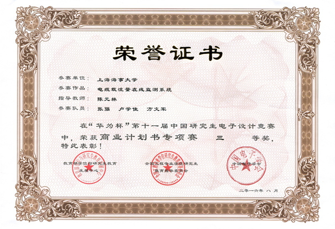 其中,由信息工程学院周凡老师指导,苑嗣博、蒋晶晶、尹秀玲等同学组成的“铂精灵”团队,凭借“微型无人飞行器及其图像在信息化监管中的应用”作品,获得全国二等奖;由陈元林老师指导,张强、方文军、卢学佳等同学组成的“海岸萤光”团队,凭借“复合海缆载流量在线监测系统”作品,获得商业计划书专项赛全国三等奖。