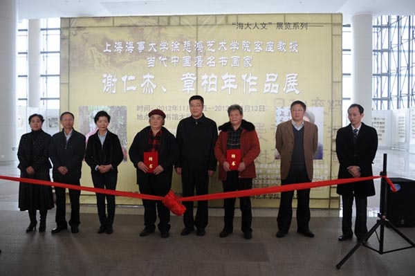 11月28日,上海海事大学徐悲鸿艺术学院客座教授、当代中国著名书法家谢仁杰、章柏年作品展开幕式在图书馆二楼大厅隆重举行。