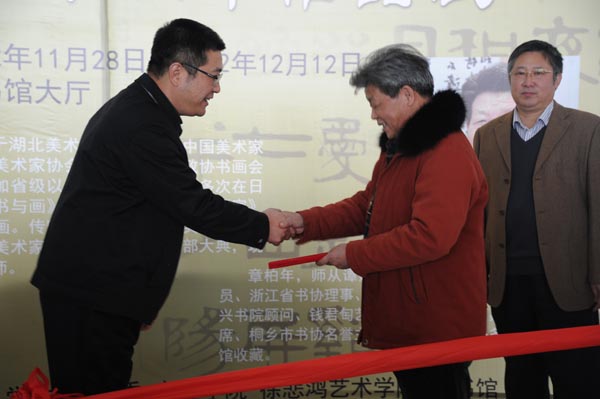 副校长杨万枫致开幕辞,并为谢仁杰、章柏年两位书法家颁发客座教授证书。谢仁杰、章柏年教授与学校文理学院、徐悲鸿艺术学院、宣传部、图书馆等相关部门负责人共同为此次作品展剪彩。