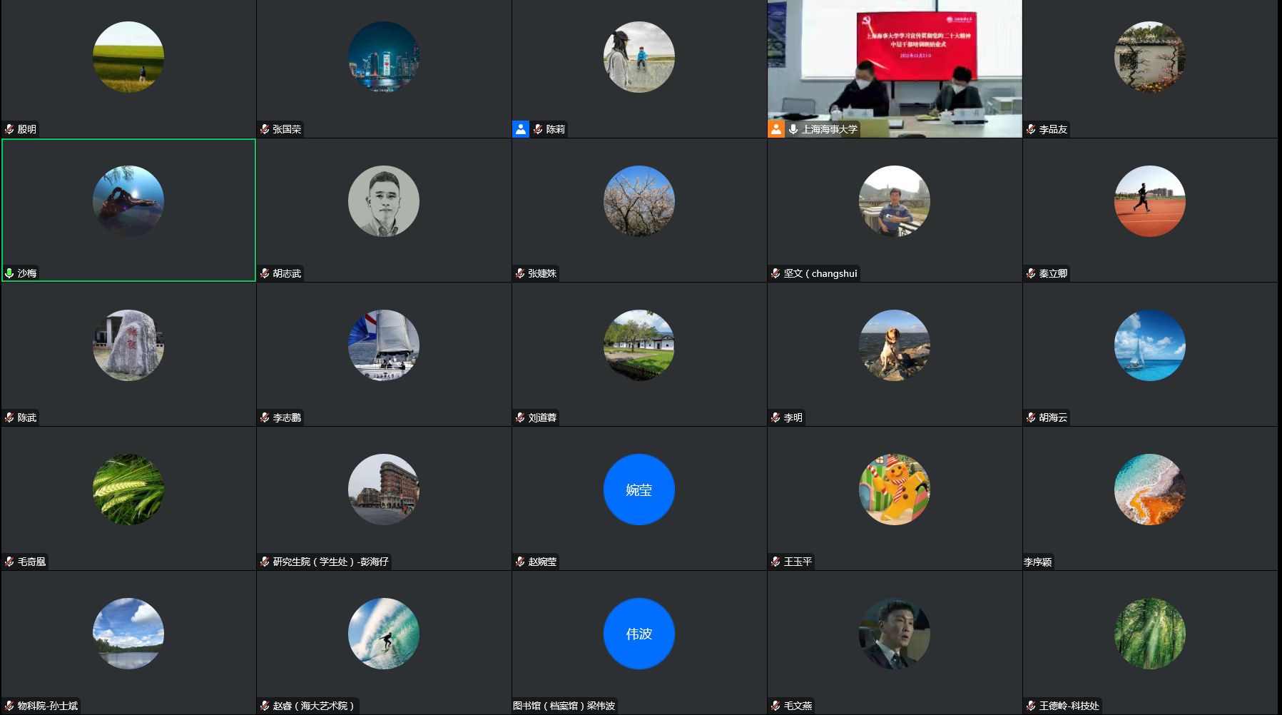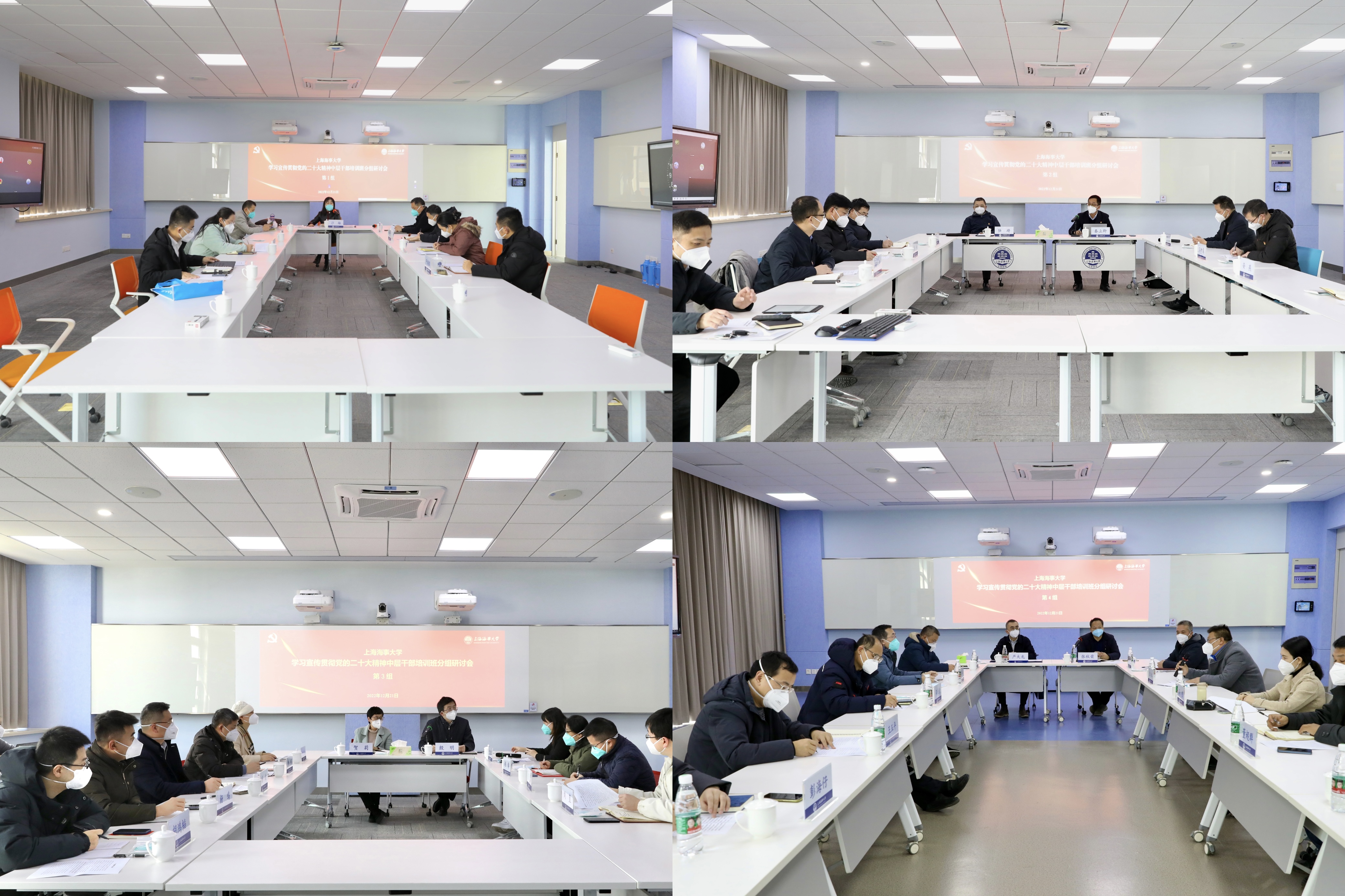 此次党的二十大精神中层干部培训班自2022年11月11日开始,历时43天,共开展辅导报告4场、二级中心组学习20场、分组研讨8场。此外,全体学员围绕党的二十大报告、《中国共产党章程(修正案)》(2022年)开展自学,圆满完成各项既定学习任务。结业式前,全体中层干部分成8个小组开展研讨,各组在校领导带领下,围绕“贯彻党的二十大精神 推动现代化航运强国建设”培训主题,结合培训班学习内容进行深入讨论。