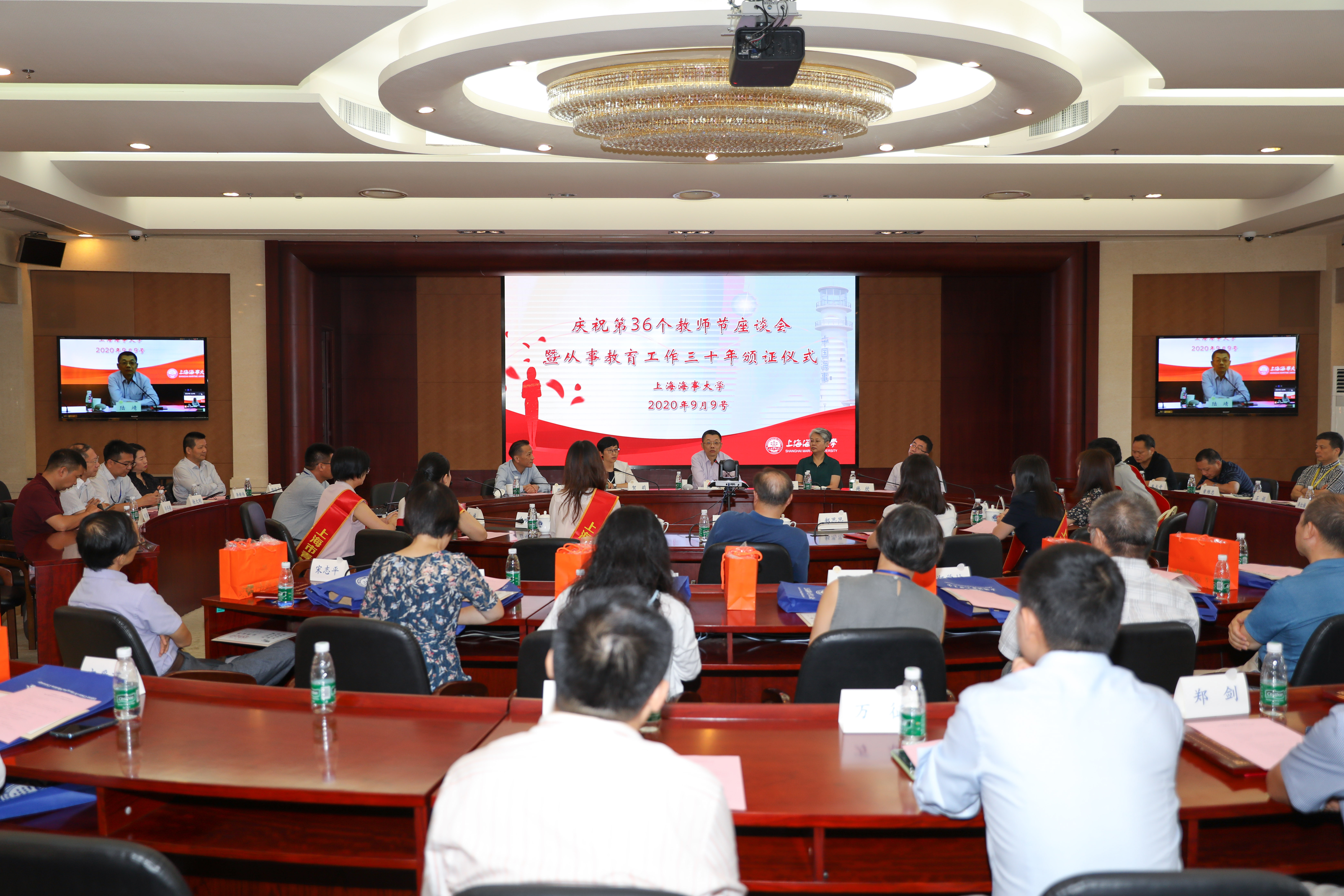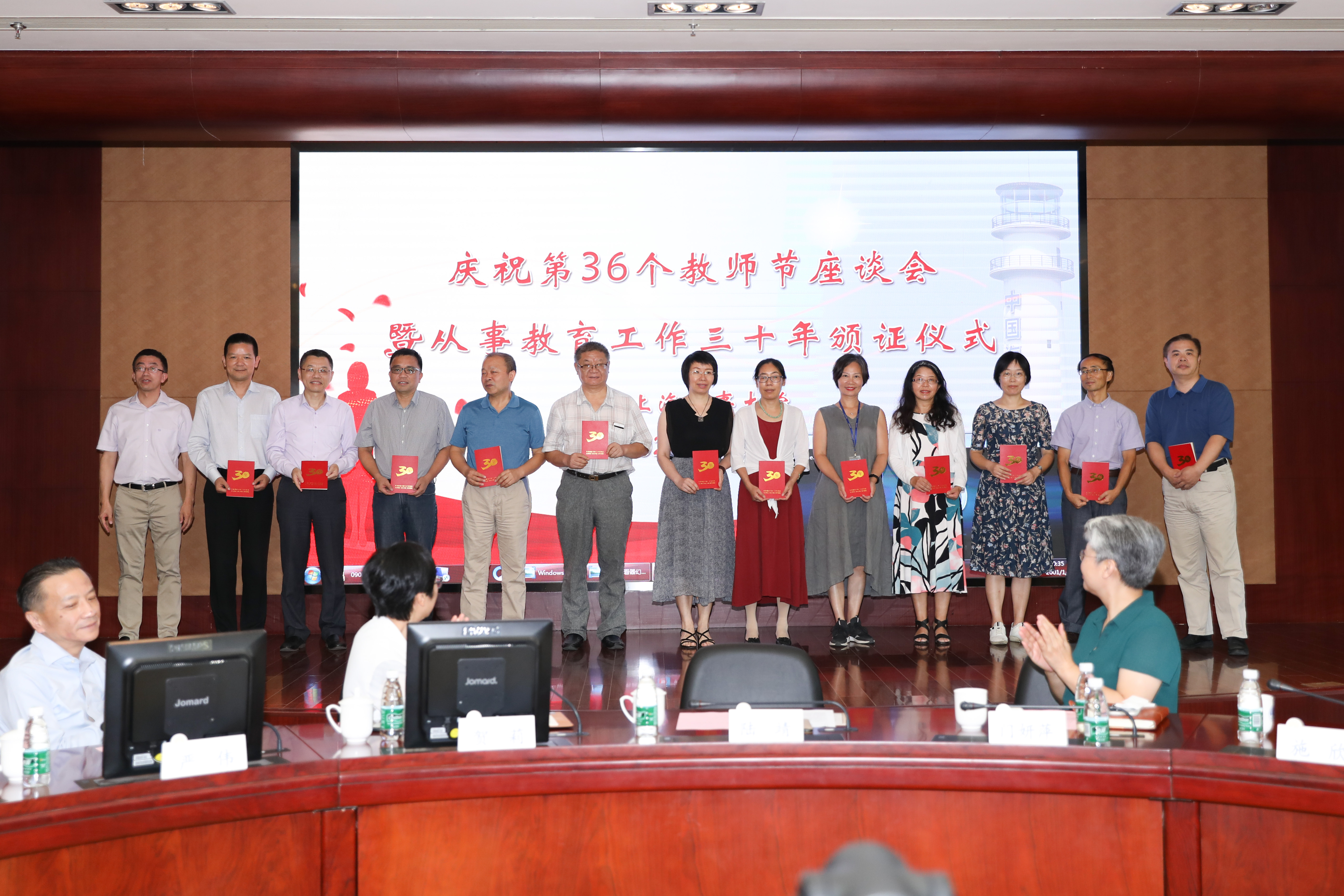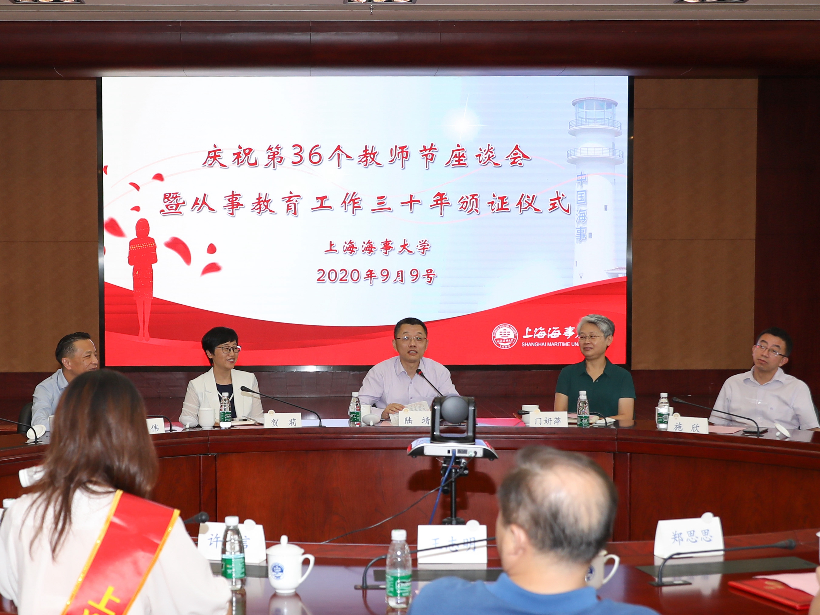 在第36个教师节即将来临之际,9月9日下午,上海海事大学举行庆祝教师节座谈会暨从事教育工作30年教师颁证仪式。校长陆靖出席并讲话,校党委副书记、纪委书记门妍萍,校党委副书记贺莉,副校长施欣、严伟,相关职能部门和学院负责人,从教30年以上教师代表、2015-2019年度上海市劳模(先进工作者)获得者、第四届上海高校青年教师教学竞赛获奖教师、第十届“师德标兵”暨“我心中的好老师”及提名奖获得者等参加会议。会议由贺莉副书记主持。