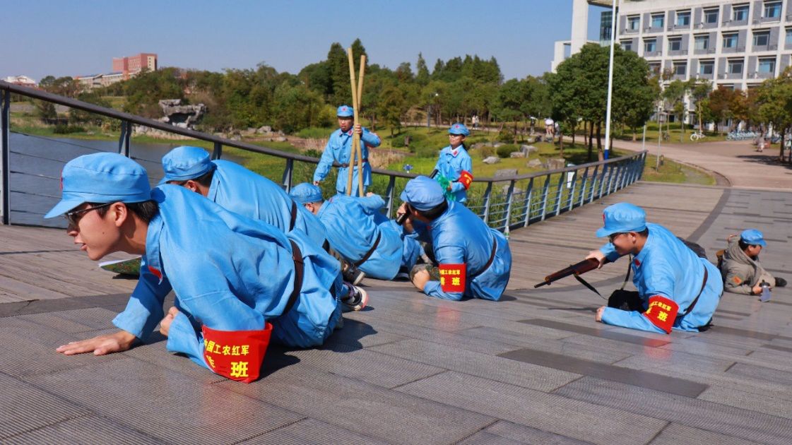 “红军行”主题实践活动以伟大长征历程为背景,五所高校师生共分为4支连队16个班,分批从国防教育基地出发,按指定路线进行一天的急行军活动。通过翻雪山、过草地、寻找草药、救护伤员、通过染毒地带等关卡设计,融入“红色剧本杀”元素,再现红军史上重要的历史事件。