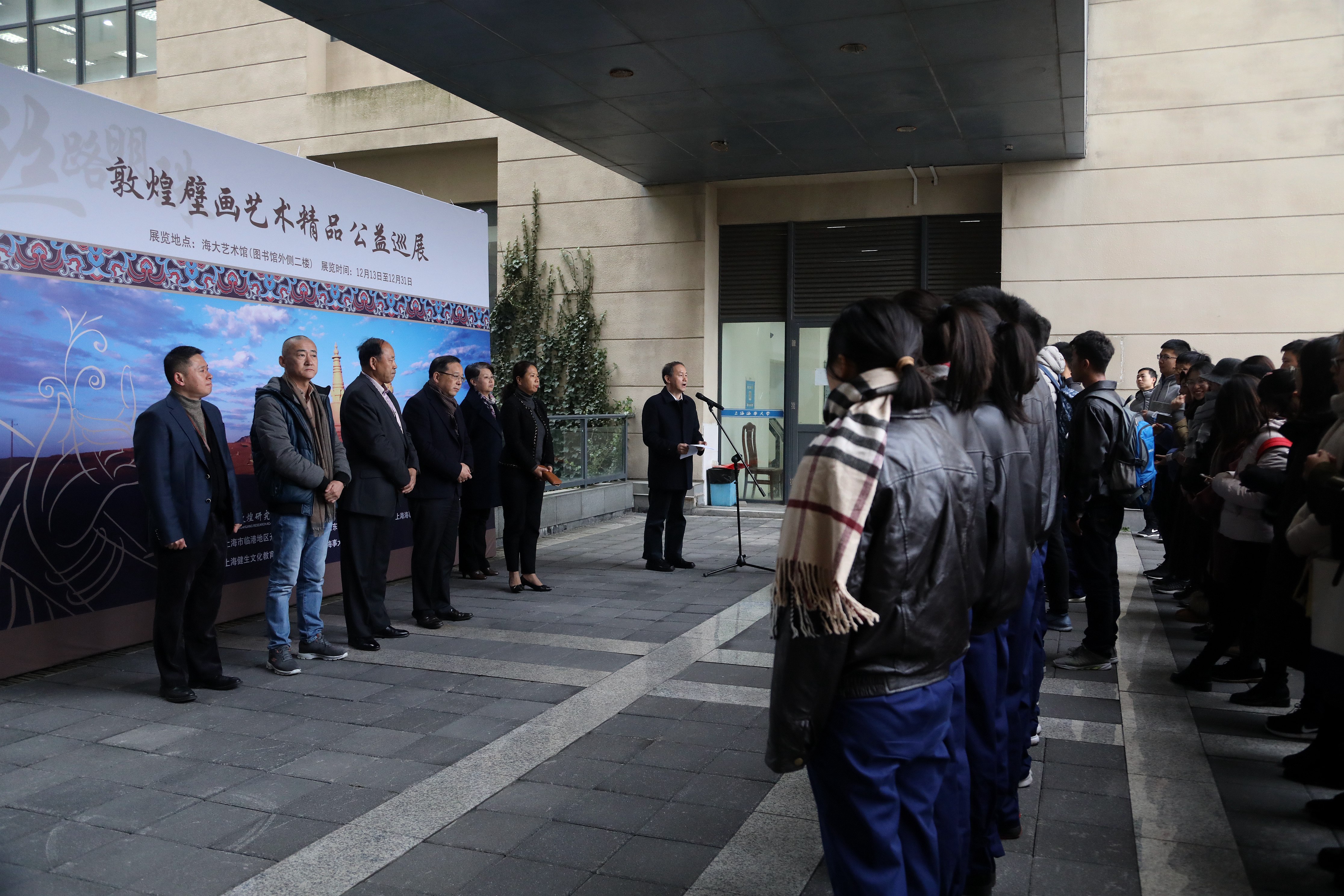 12月13日,“一带一路”敦煌壁画艺术精品走进临港高校公益巡展在我校开幕。中国敦煌石窟保护基金会理事长杨秀清、中国敦煌石窟保护基金会副秘书长张伟文、浦东新区副区长李国华、临港管委会组织人事办公室主任苗挺、临港管委会经济贸易办公室副主任冀晓红,我校党委书记金永兴、校党委副书记门妍萍以及广大师生等出席开幕式,并一起参观精品展,充分感受敦煌艺术的魅力。