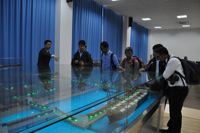 来宾一行参观了虚拟港航企业经营管理实验室、现代港口综合实验室、航海模拟器等,并听取交通运输学院郑士源教授所做的有关港口运营管理的讲座。