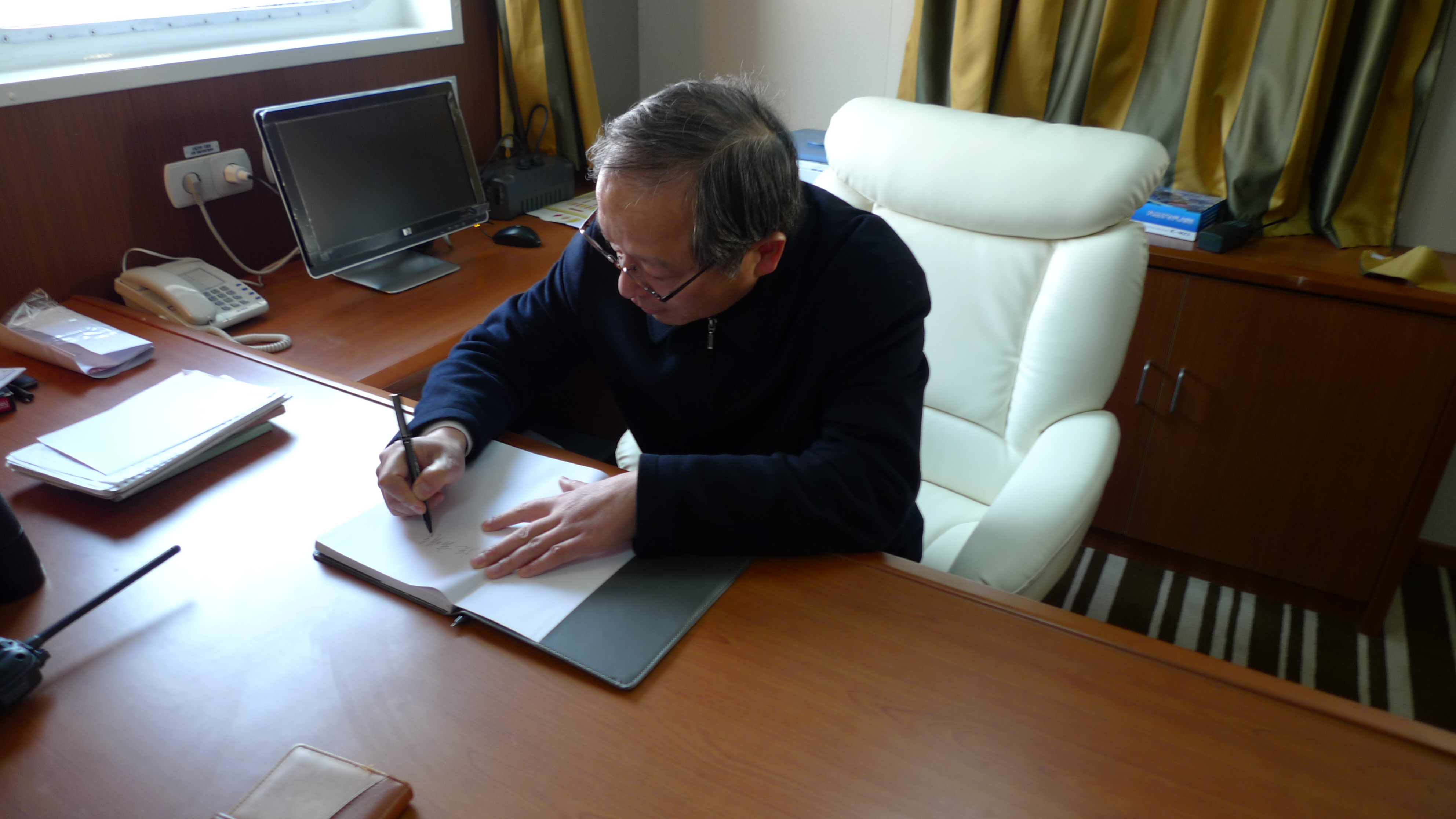 於世成书记一行考察了“育明”轮驾驶台、机舱、船员餐厅。於世成书记与“育明”轮熊涛船长亲切合影,并题词“祝育明轮一帆风顺,祝熊船长马到成功”。