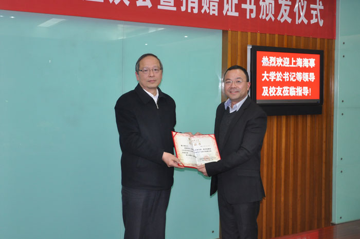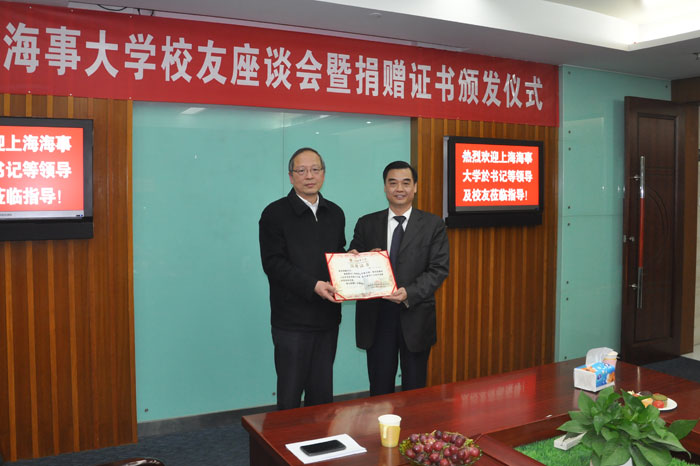 座谈会上,上海海事大学教育发展基金会举行了捐赠证书颁发仪式,於世成书记、杨万枫副校长分别代表学校向欧阳海鹏和魏万城两位热心校友颁发了捐赠证书及纪念牌,对他们给予学校教育事业作出的突出贡献表示最诚挚的谢意。