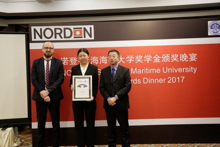 11月22日,我校举行第13届上海海事大学—诺登奖学金、奖教金颁奖礼。丹麦诺登轮船上海代表处总经理严森先生、我校施欣副校长等出席颁奖礼。赵凤新、王攸妙、彭子桢、宋璐和杜鸣盛等5位同学荣获“诺登奖学金”,经济管理学院李梓毓老师和商船学院李国祥老师荣获“诺登最佳教师奖”。 2017-11-24, 星期五 -