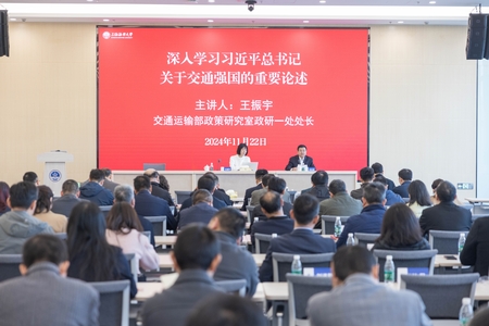为深入学习贯彻党的二十届三中全会和全国教育大会精神,更好把握交通强国建设的新任务、新目标,11月22日,学校召开党委理论学习中心组学习会,交通运输部政策研究室政研一处处长王振宇应邀来校作辅导报告。校领导,全体中层干部,相关学科带头人等教师代表参加了此次学习会。学习会由校党委书记宋宝儒主持。 2024-11-23, 星期六 -