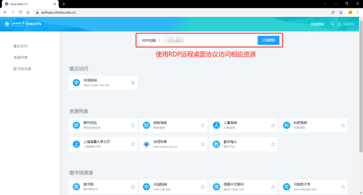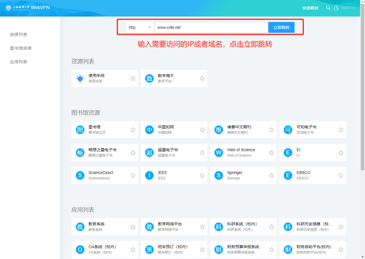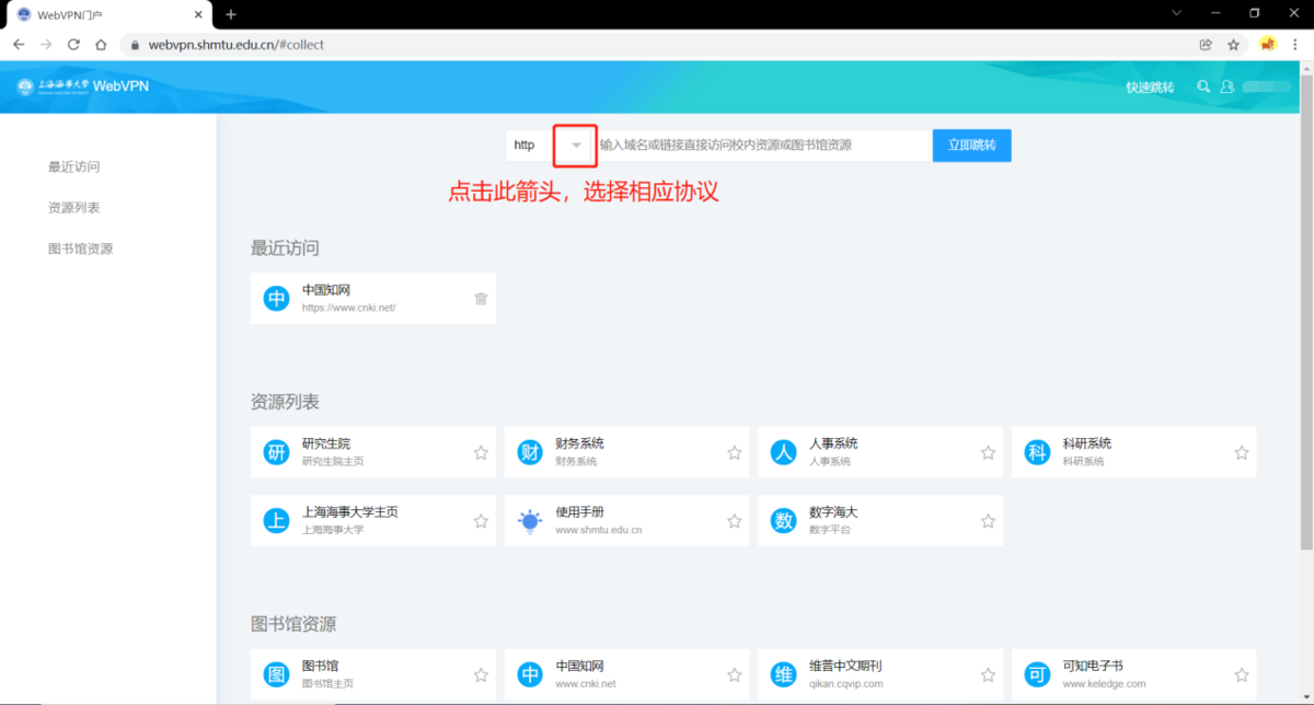 2.3 自定义访问资源;点击“▽”,选择相应协议,访问自己的资源。点击右上角快速跳转,可隐藏跳转栏。