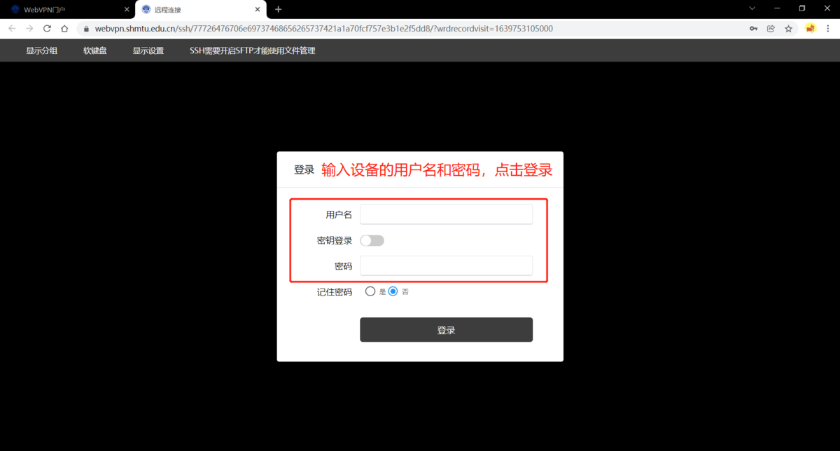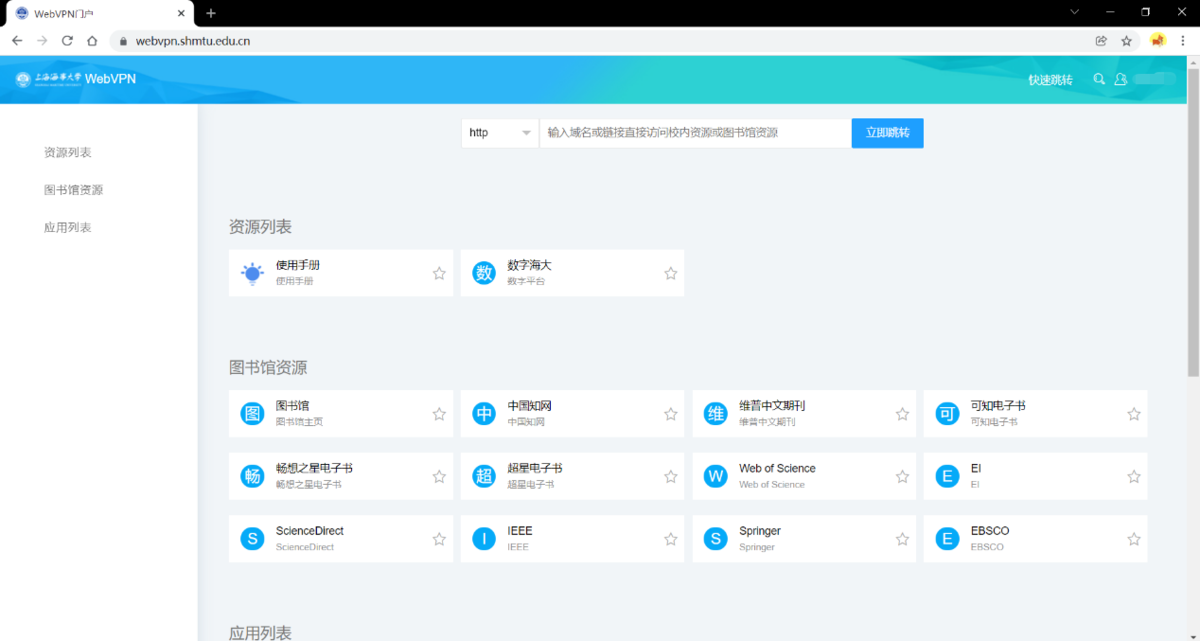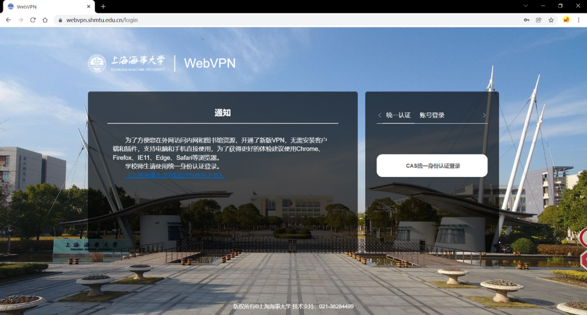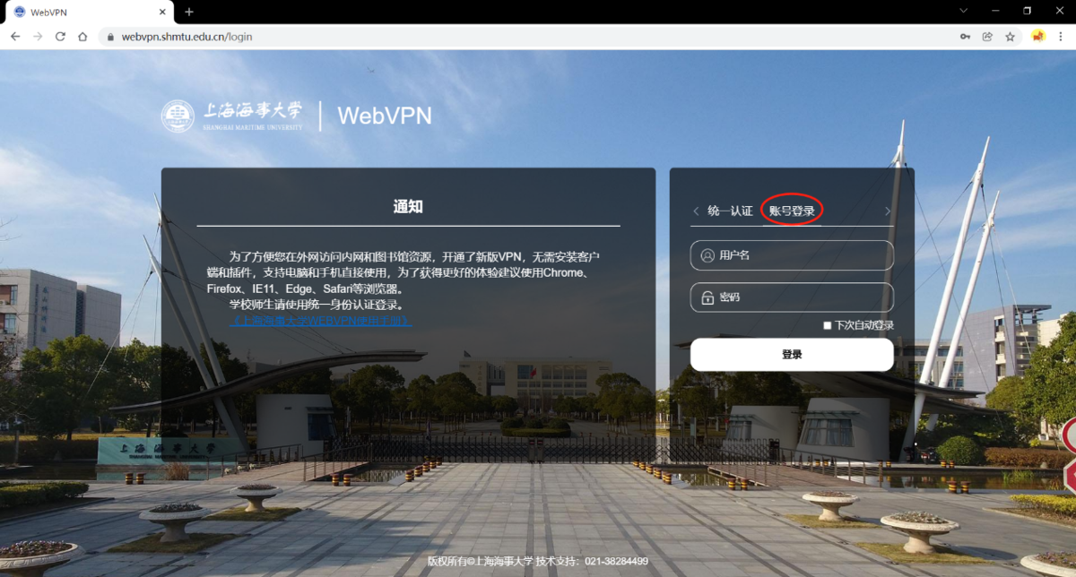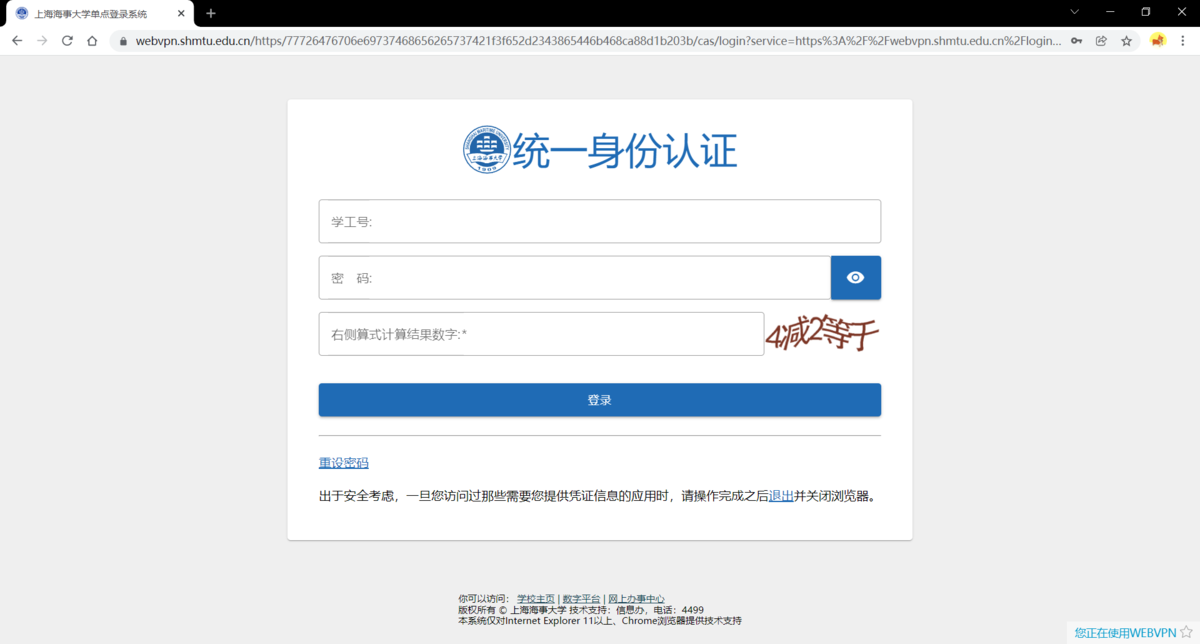 1.1 在Chrome、Safari、Firefox 等浏览器中输入"https://webvpn.shmtu.edu.cn"进入登录界面。