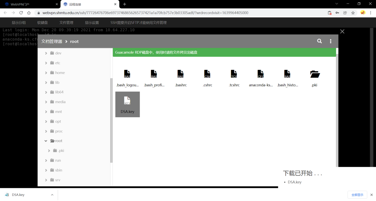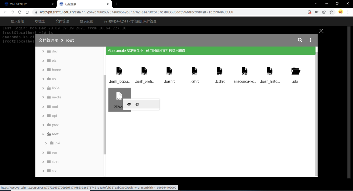 远程通过SSH链接上设备后,点击左上角文件管理,在弹出的文档管理器窗口内选择相应的文件右键点击下载,下载后的文件将保存在当前所使用的浏览器的下载目录中