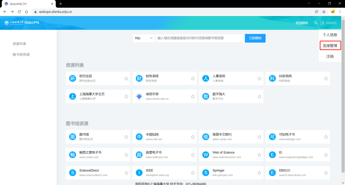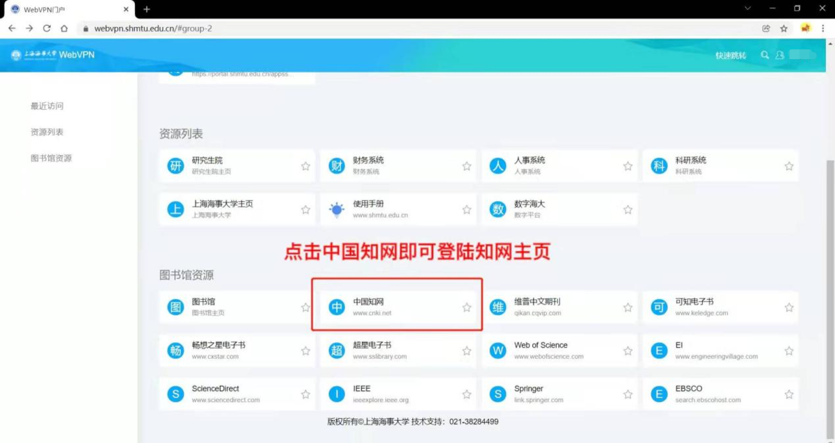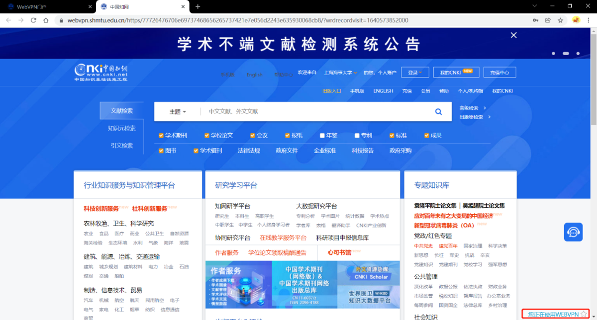 2.2 若网页右下角显示“您正在使用WEBVPN”字样,表示您正在使用WEBVPN访问资源。