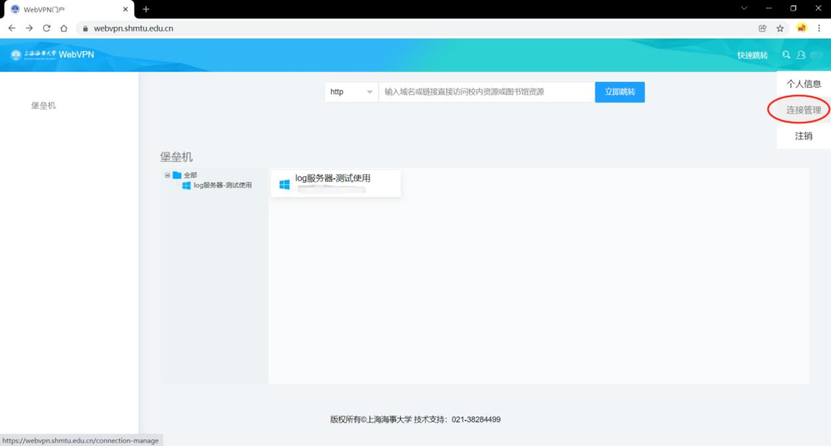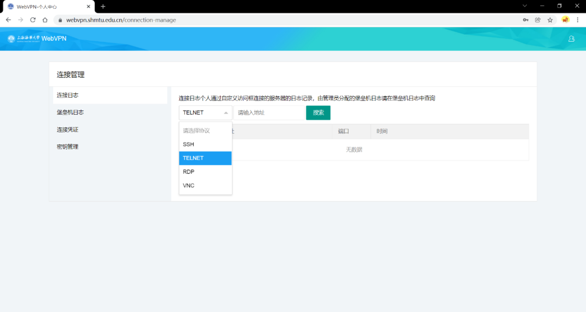 3.1 连接管理:点击右上角用户名后可点击连接管理,可进行用户对连接日志在自定义访问栏使用各种协议访问设备的日志,包含协议、地址、端口、时间等各种信息。支持通过协议和地址进行筛选查询。