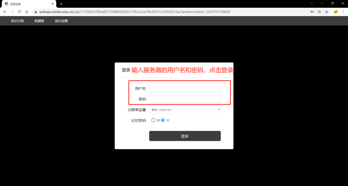 可设置显示分辨率。勾选“记住密码”后,系统自动保留登录凭证,下次RDP登录该主机时可自动登录。