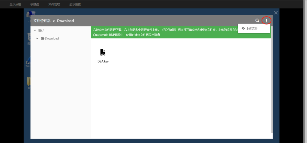 按钮选择“上传文件”后跟随后续操作即可上传文件至WRD RDP网络共享磁盘中的Download文件夹中,后续可拷贝到本地磁盘。