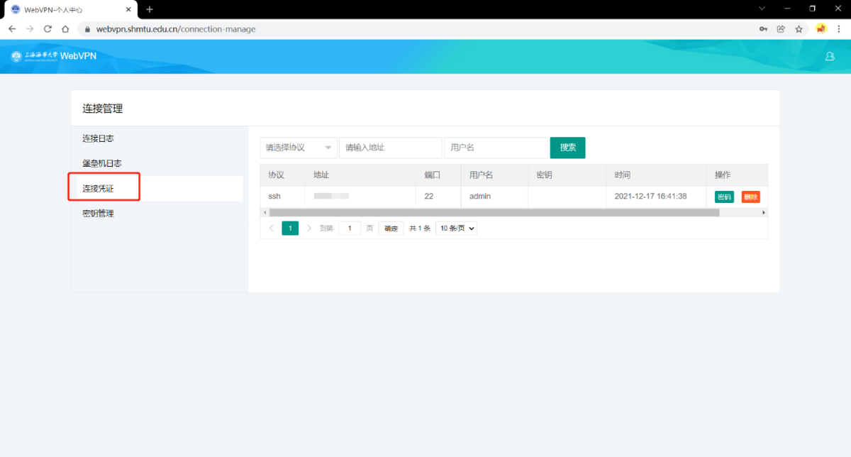 登录凭证可在“用户”→“连接管理”→“连接凭证”中进行编辑和删除。